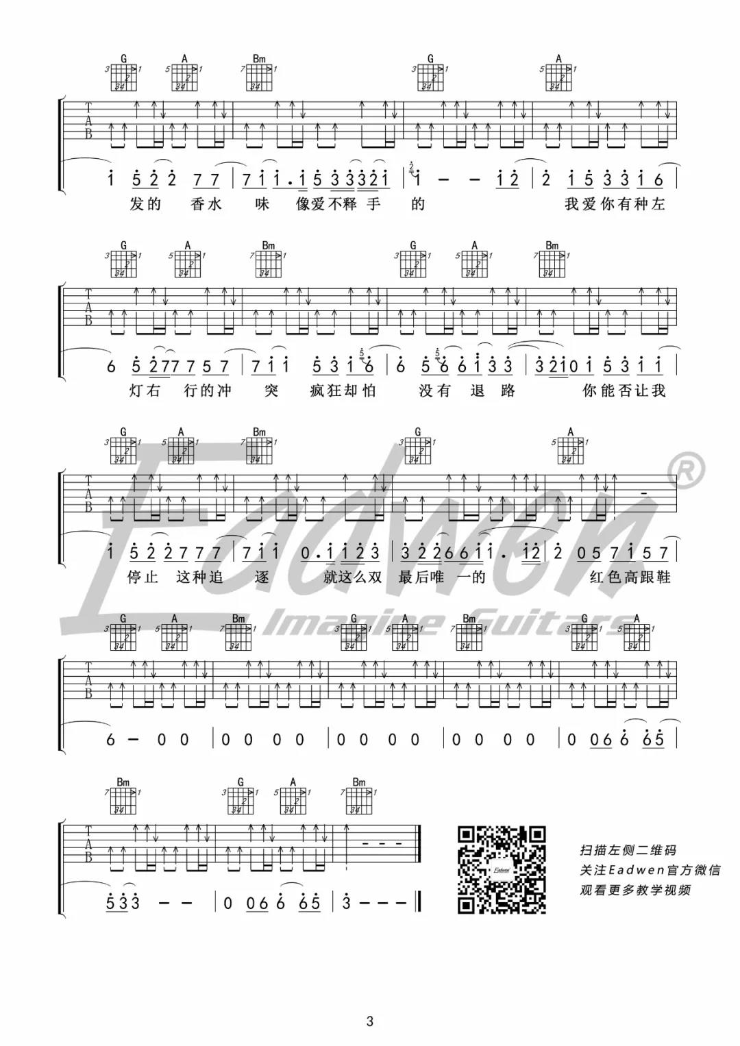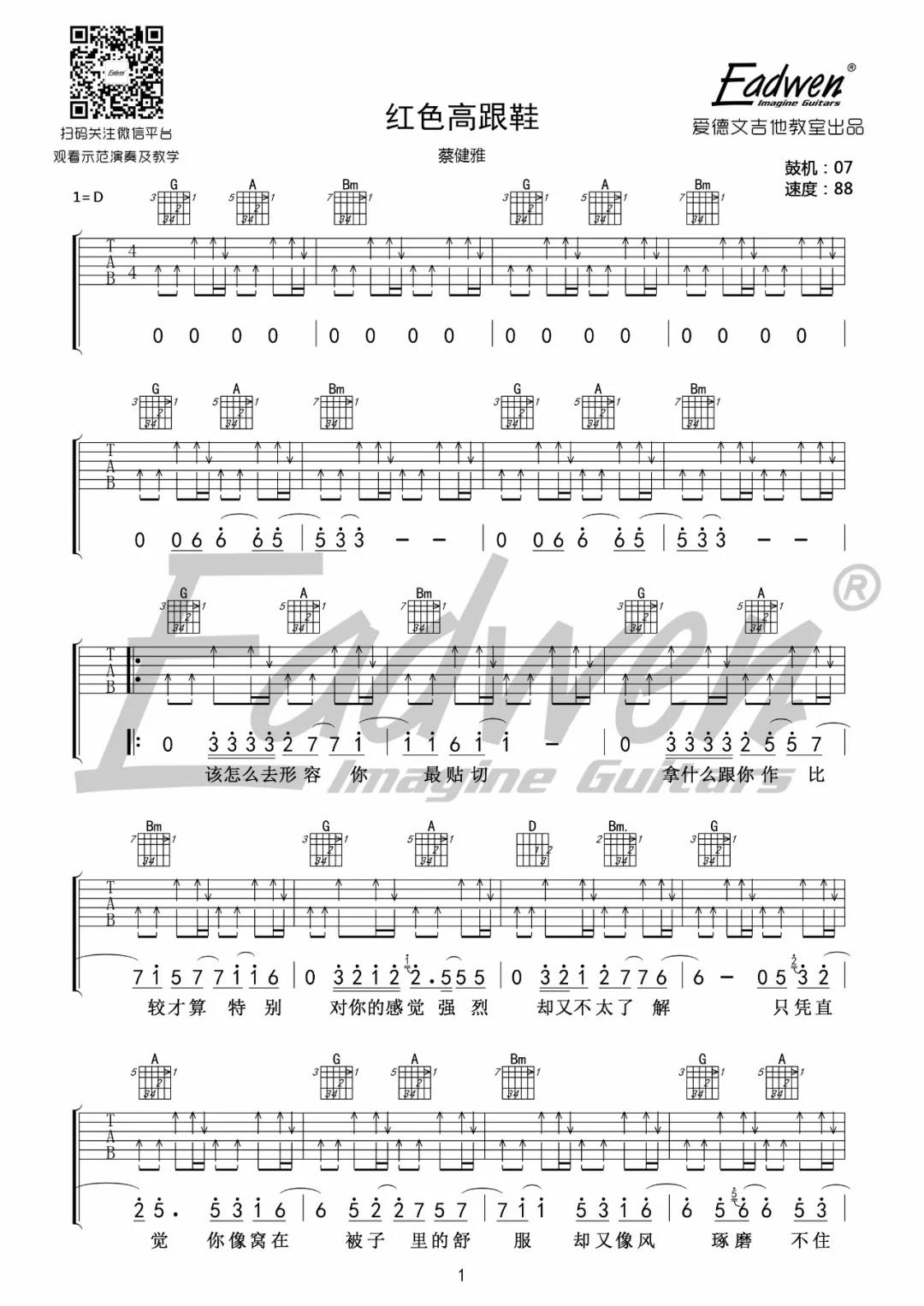 曲谱介绍: 蔡健雅《红色高跟鞋》吉他弹唱谱,采用D调指法编配,共有3张高清图谱。