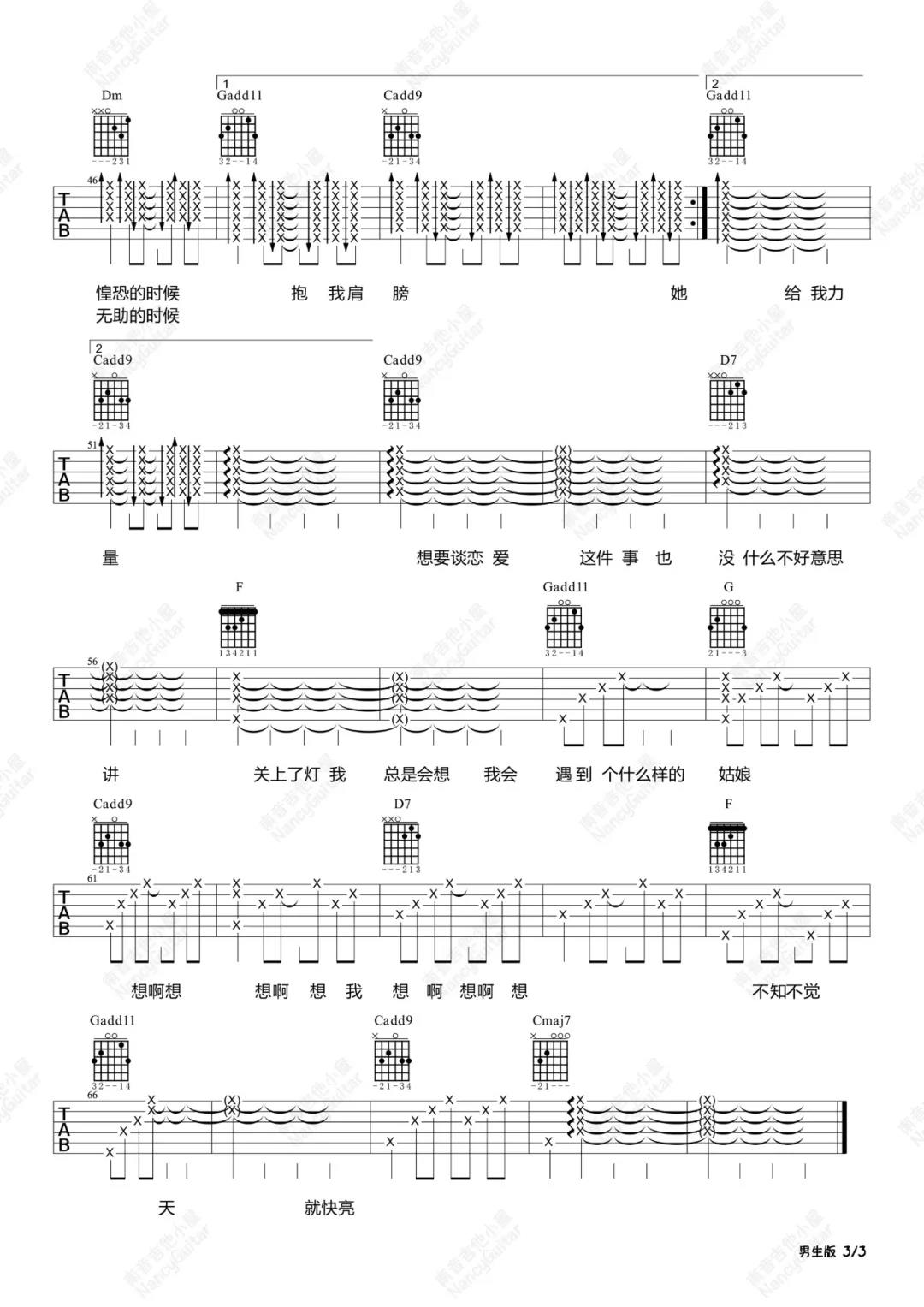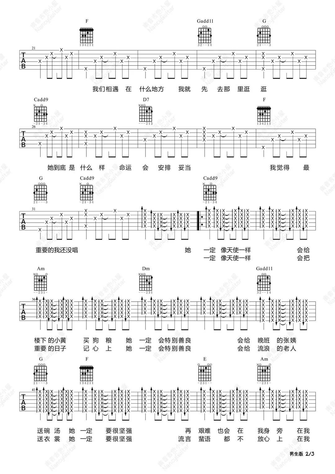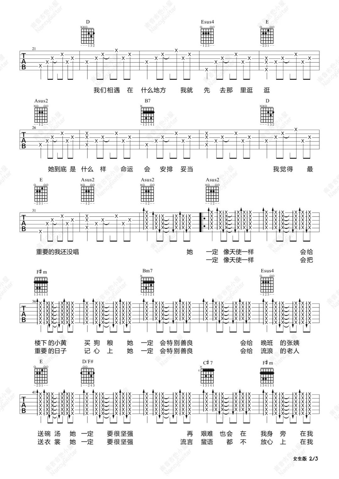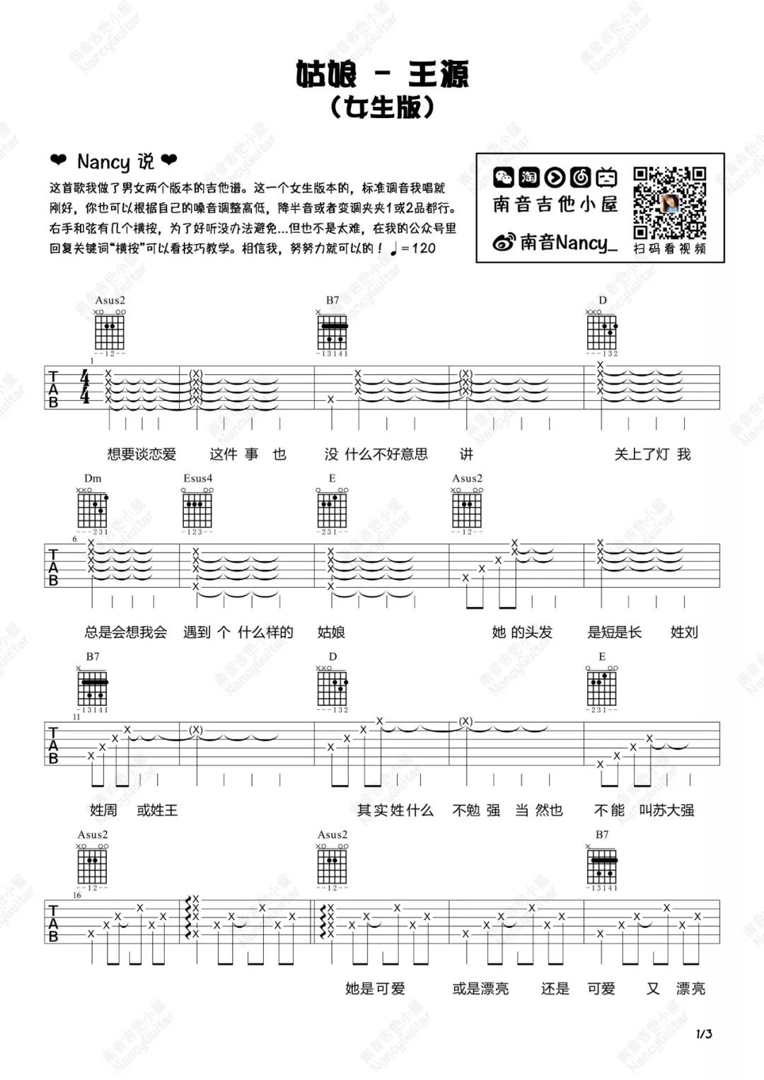 曲谱介绍: 王源《姑娘》吉他弹唱谱,采用A调指法编配,共有6张高清图谱。