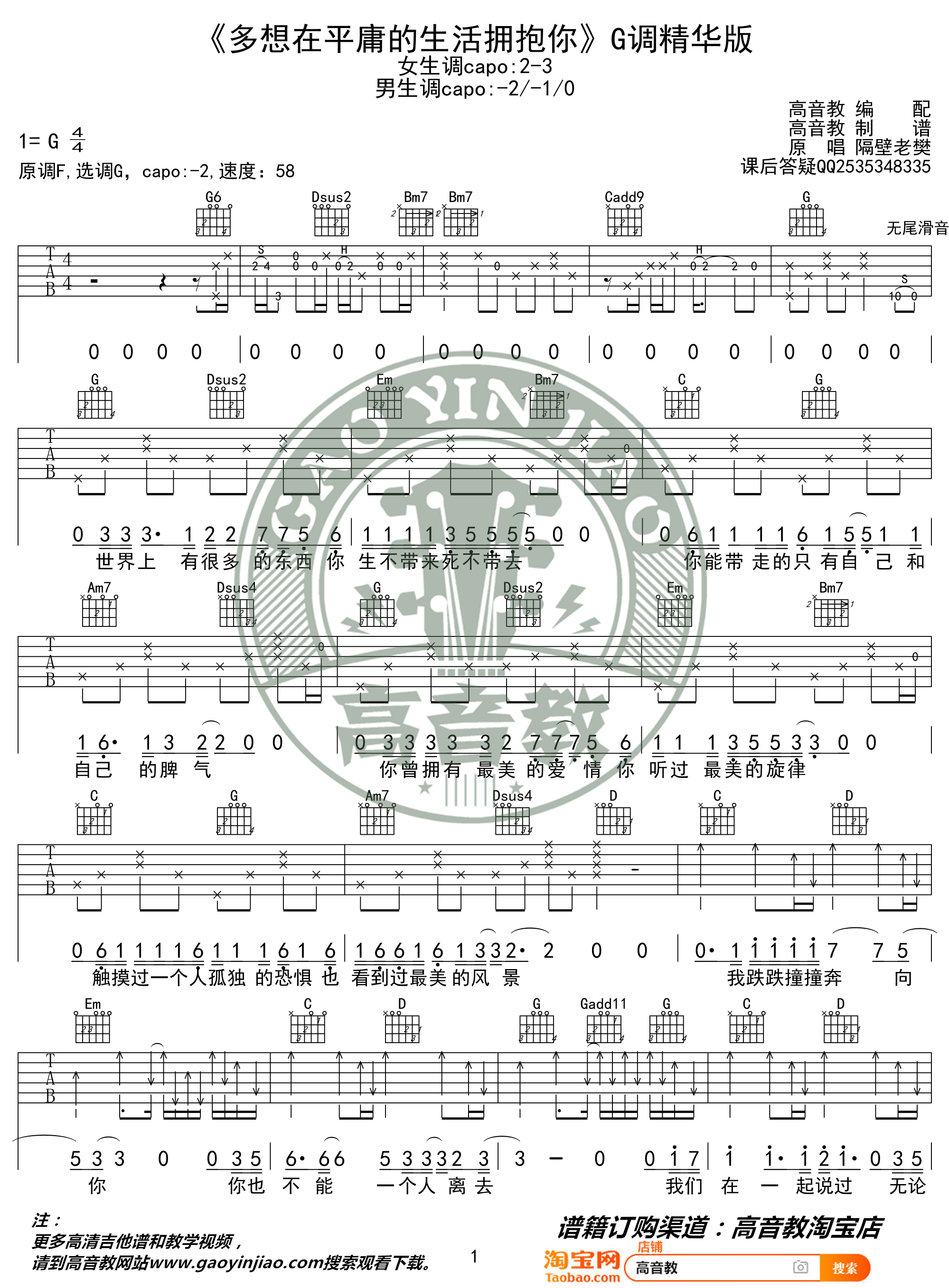 多想在平庸的生活拥抱你 精华版吉他谱 - 隔壁老樊 - G调吉他弹唱谱