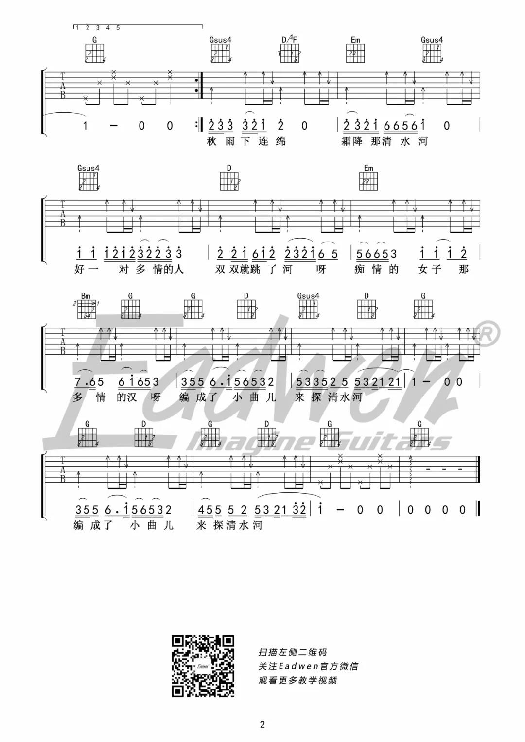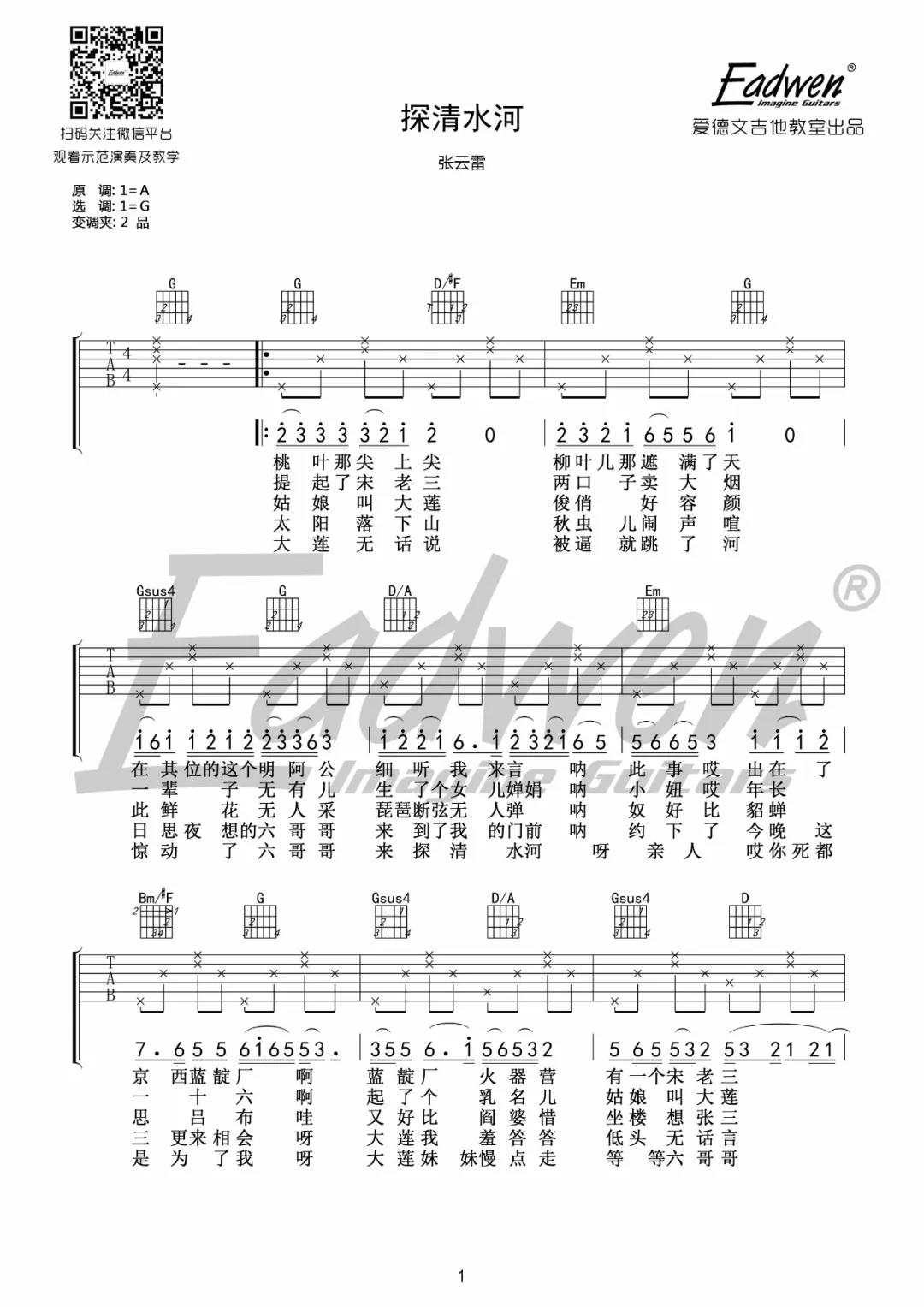 曲谱介绍: 张云雷《探清水河》吉他弹唱谱,采用G调指法编配,共有2张高清图谱,免翻页排版设计。