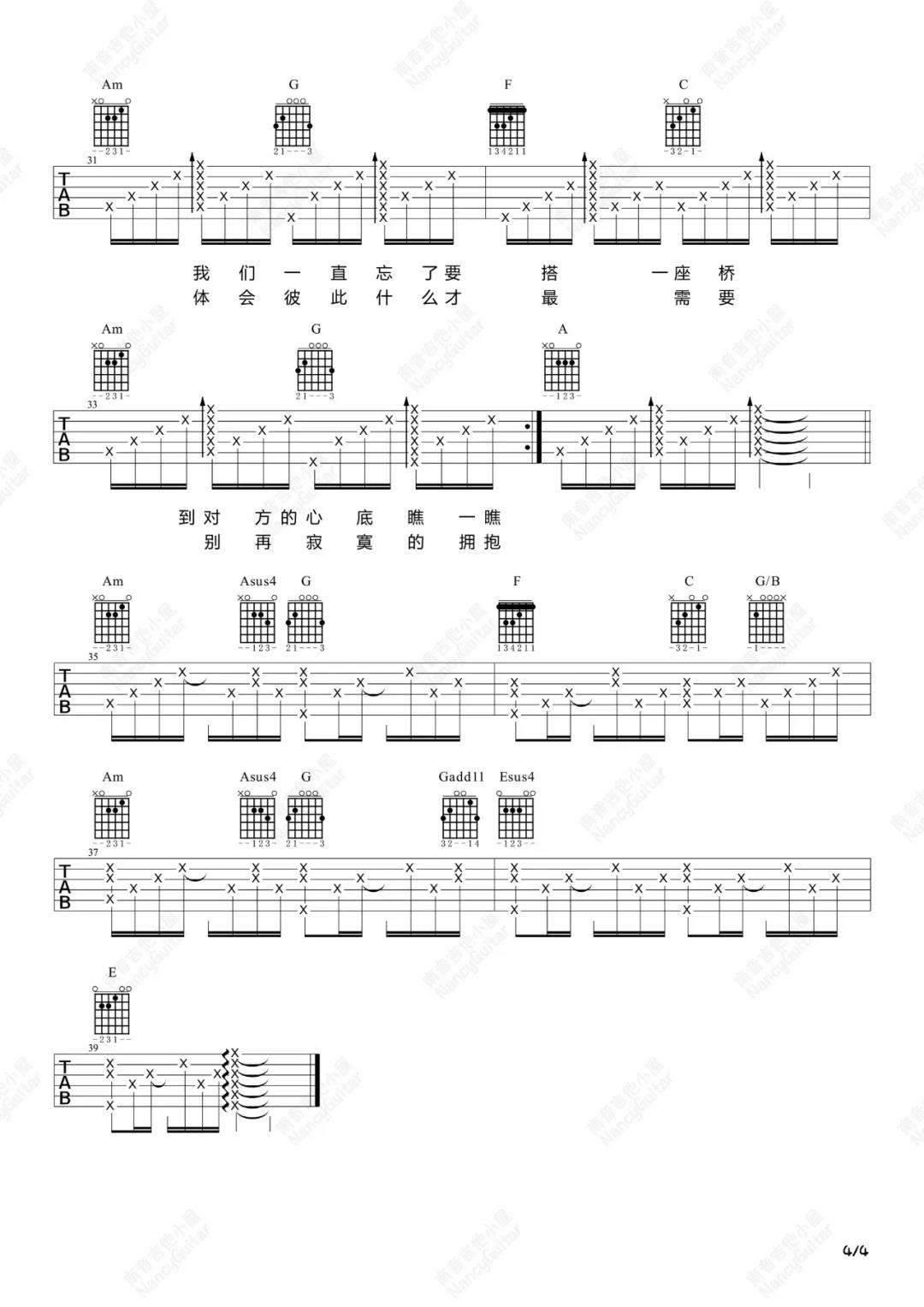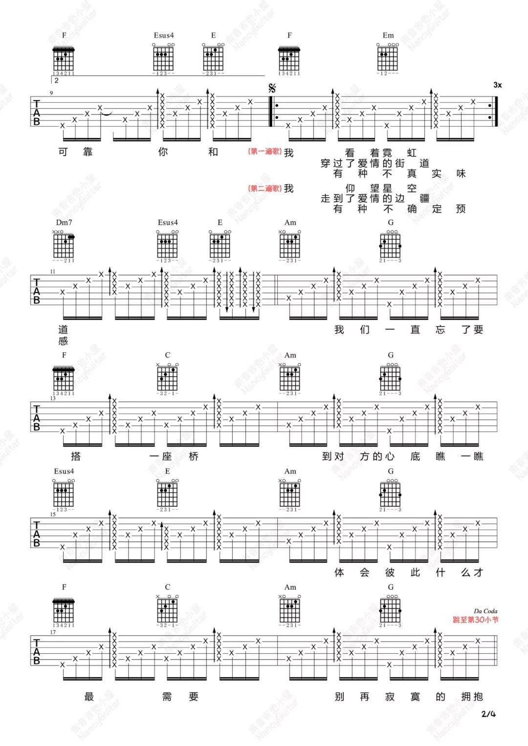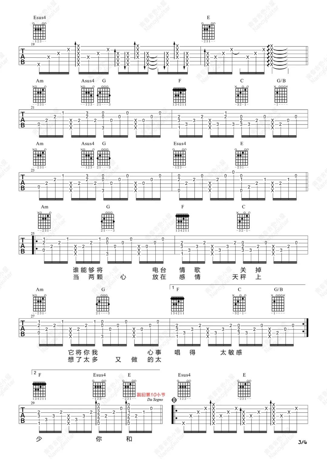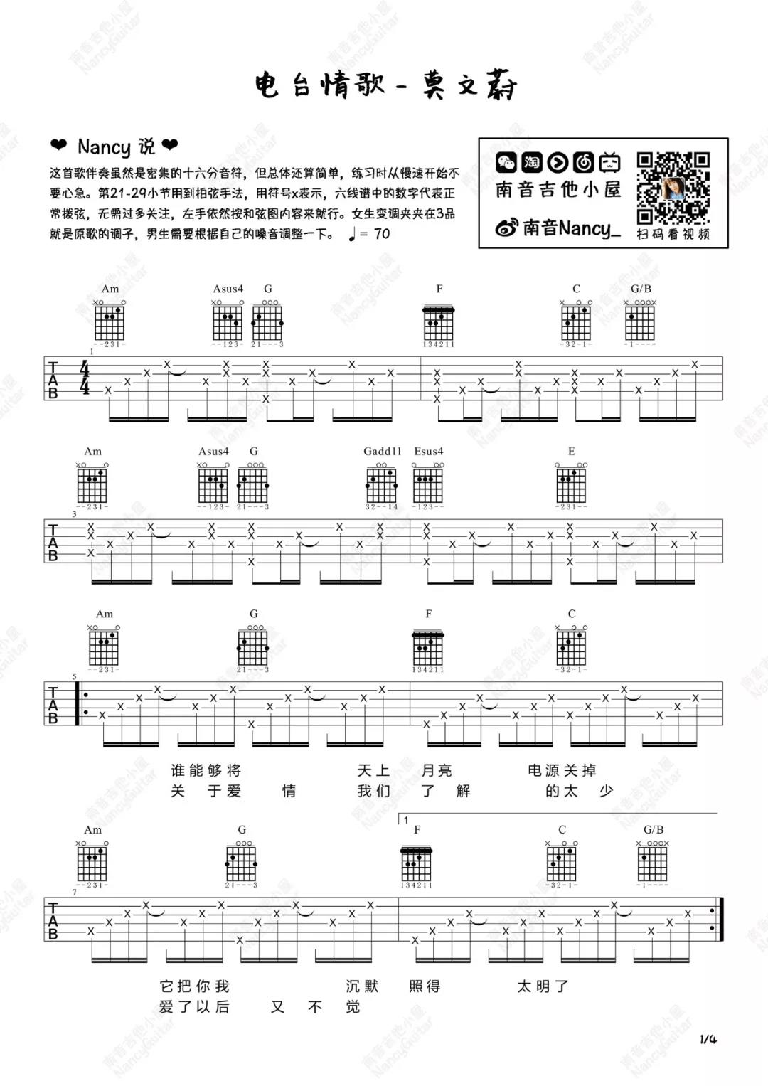曲谱介绍: 莫文蔚《电台情歌》吉他弹唱谱,采用A调指法编配,共有4张高清图谱。