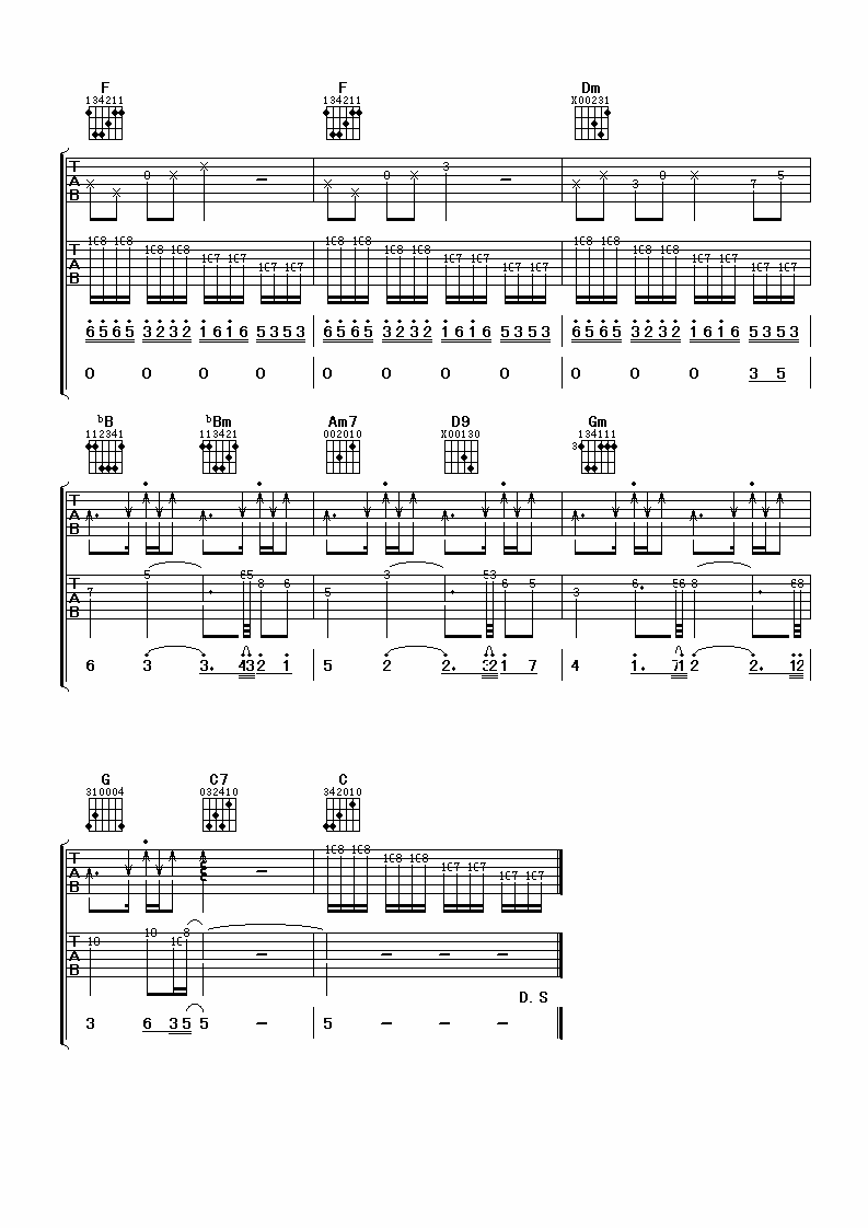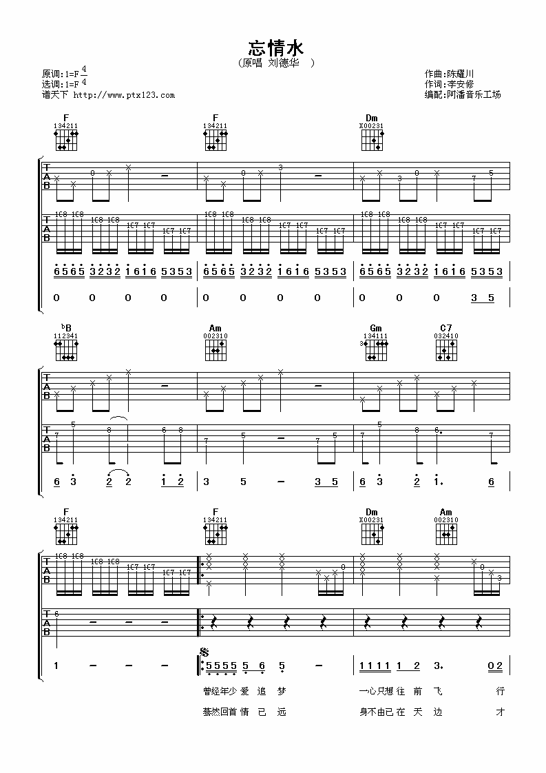 曲谱介绍: 刘德华《忘情水》吉他弹唱谱,采用F调指法编配,共有3张高清图谱。