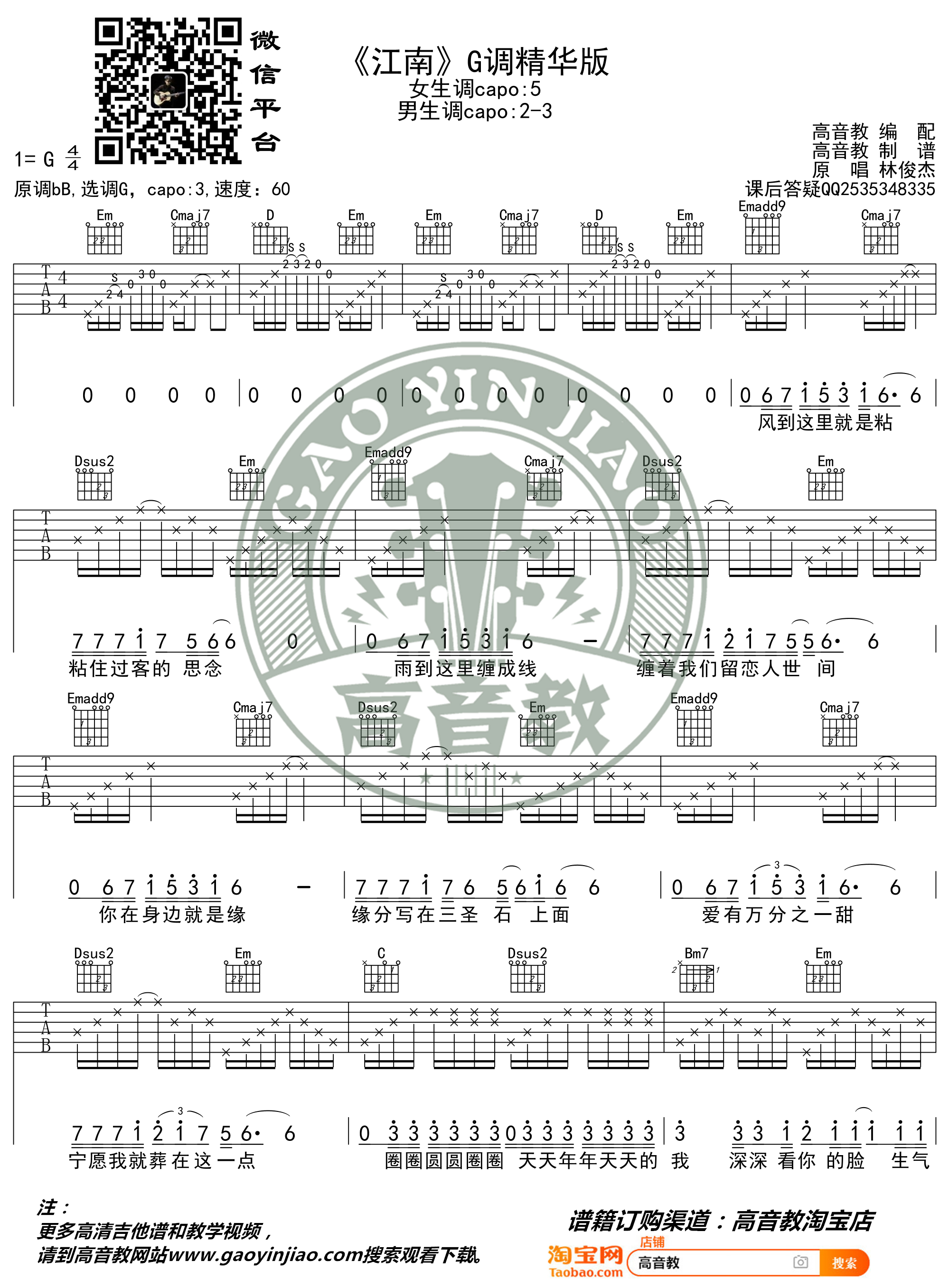 曲谱介绍: 林俊杰《江南》吉他弹唱谱,采用G调指法编配,共有2张高清图谱,免翻页排版设计。