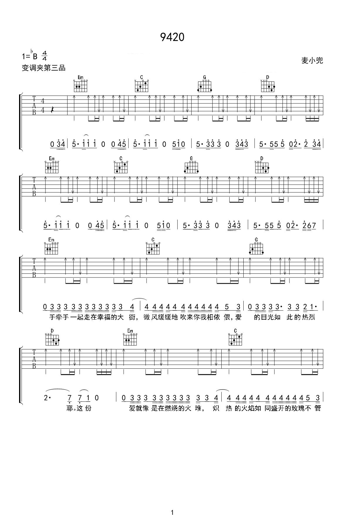 曲谱介绍: 麦小兜《9420》吉他弹唱谱,采用B调指法编配,共有3张高清图谱。