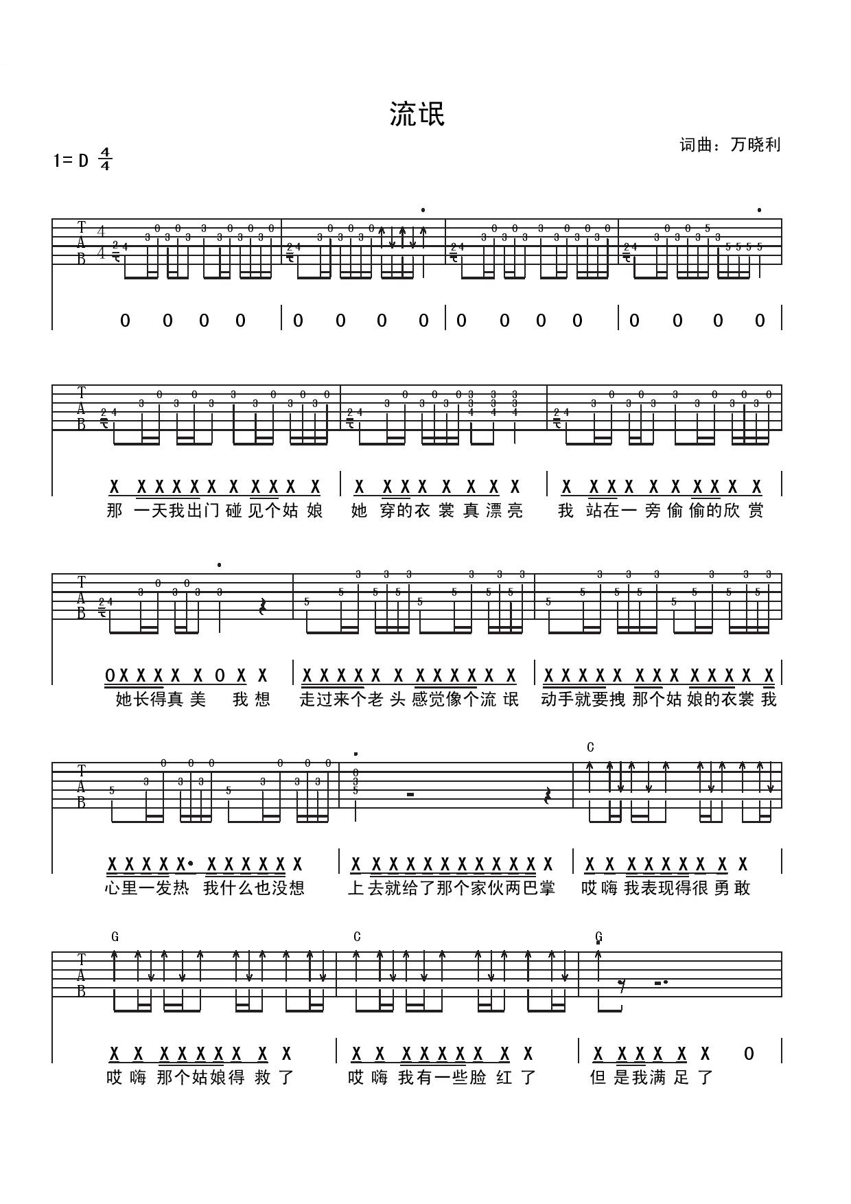 曲谱介绍: 万晓利《流氓》吉他弹唱谱,采用D调指法编配,共有4张高清图谱。