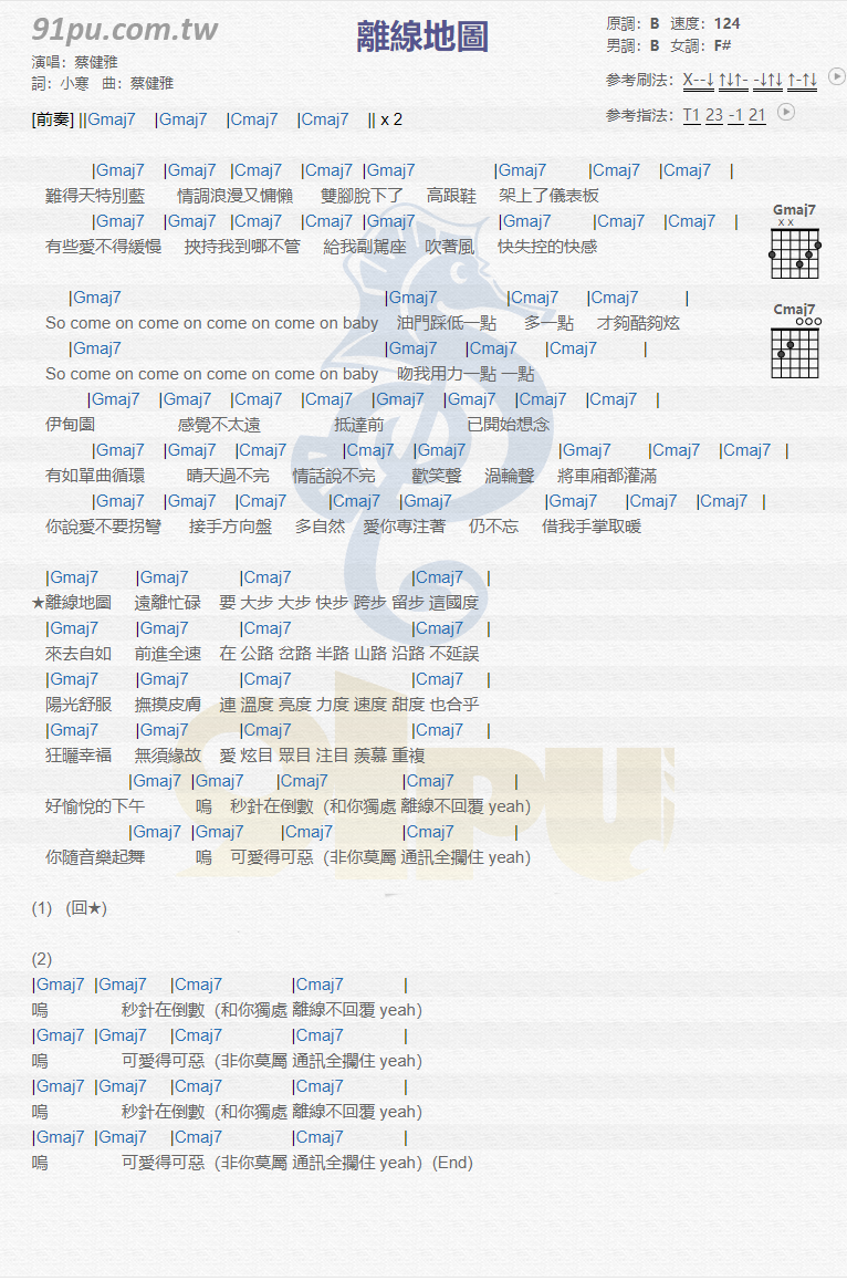 曲谱介绍: 蔡健雅《离线地图》吉他弹唱谱,采用B调指法编配,共有1张高清图谱,免翻页排版设计。
