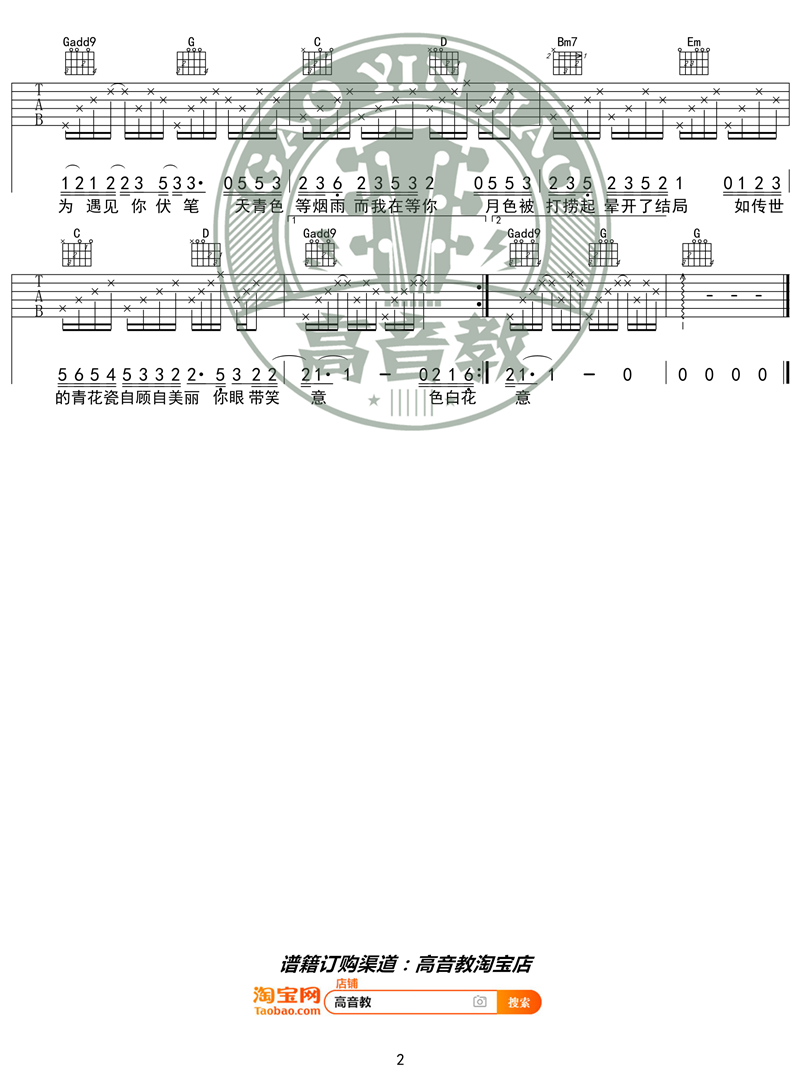 曲谱介绍: 周杰伦《青花瓷入门版》吉他弹唱谱,采用G调指法编配,共有2张高清图谱,免翻页排版设计。