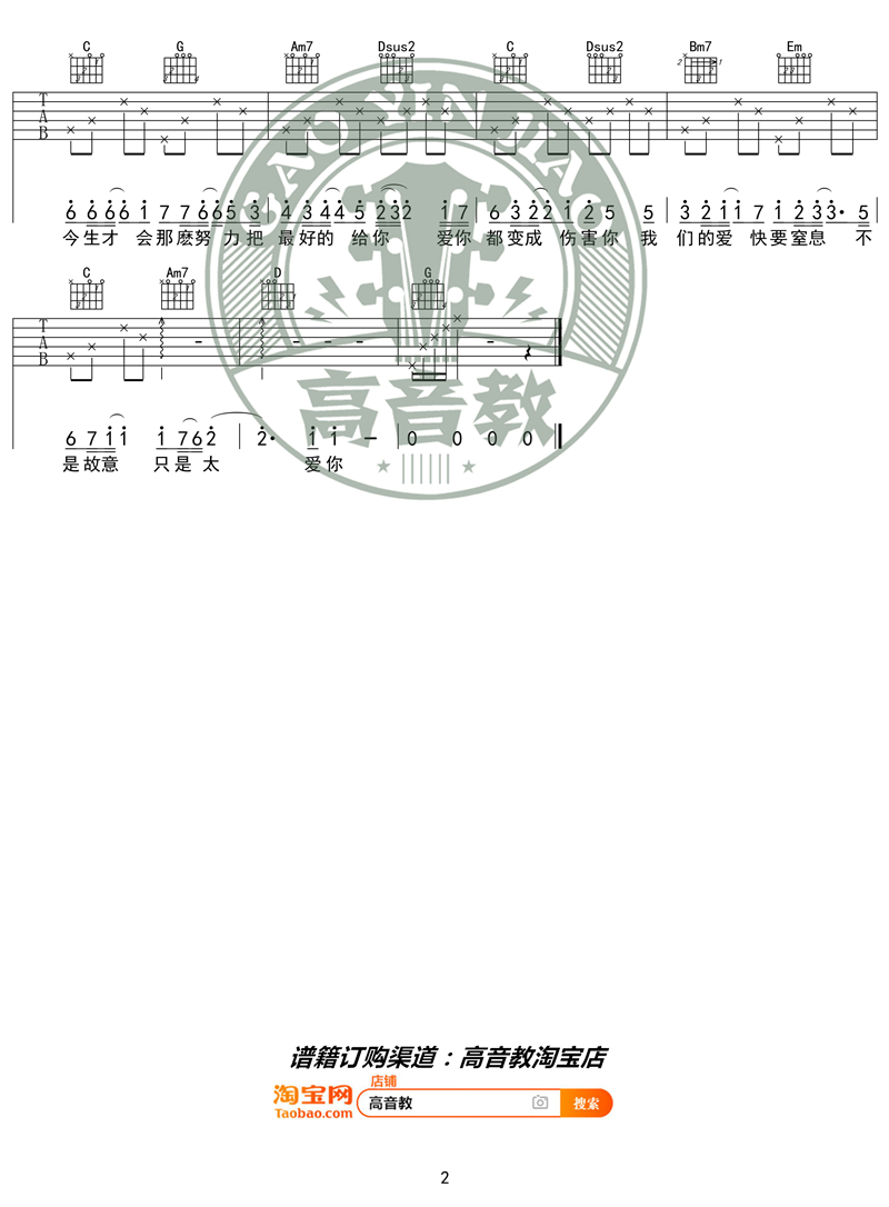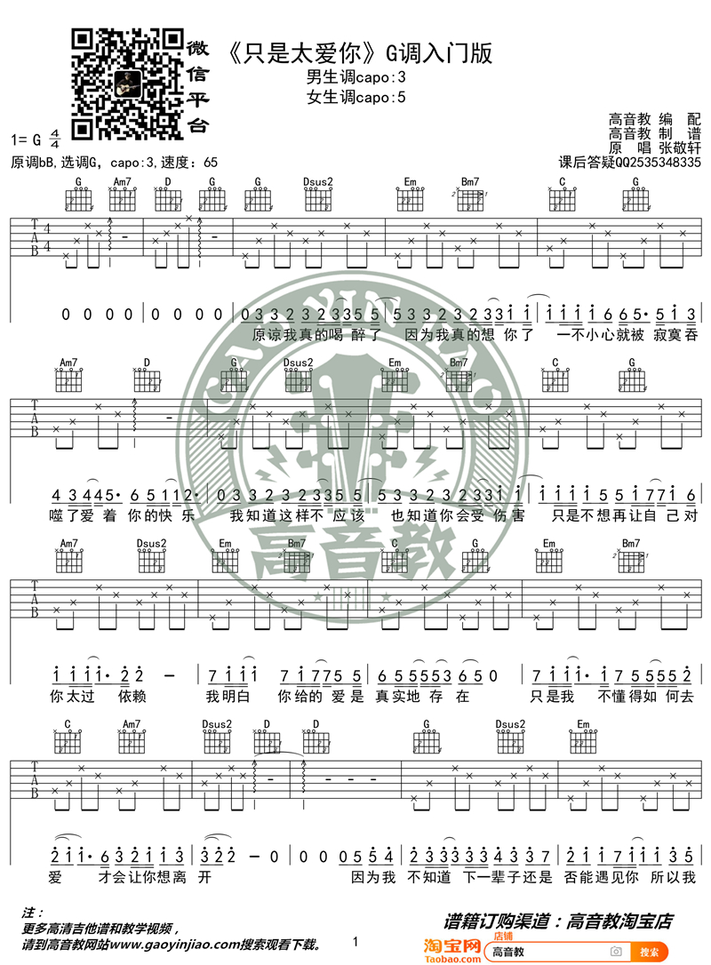 曲谱介绍: 张泽熙《只是太爱你》吉他弹唱谱,采用G调指法编配,共有2张高清图谱,免翻页排版设计。