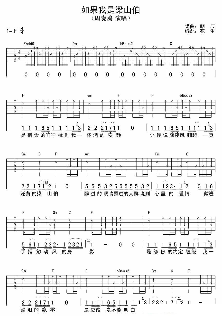 曲谱介绍: 周晓鸥《如果我是梁山伯》吉他弹唱谱,采用F调指法编配,共有2张高清图谱,免翻页排版设计。