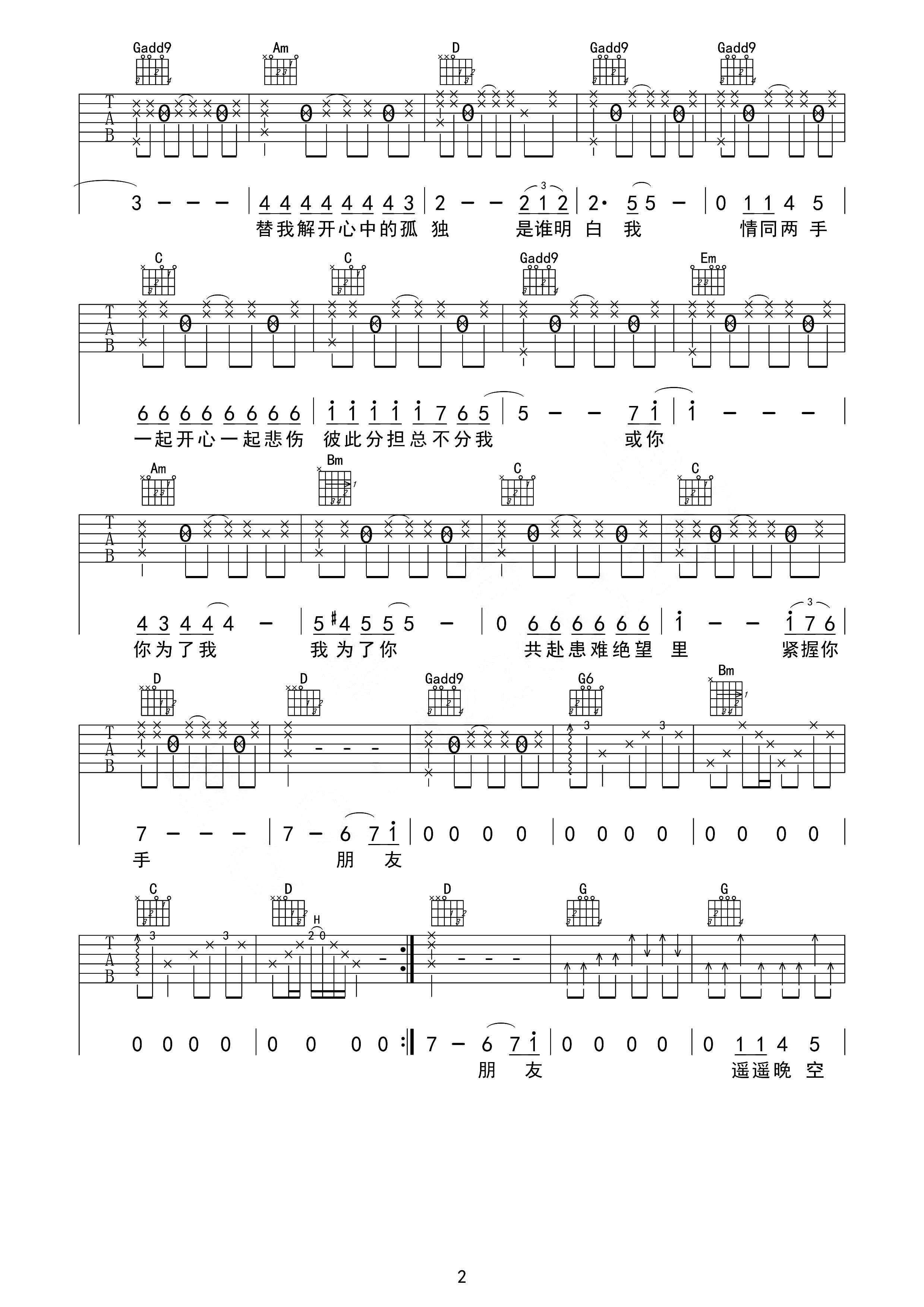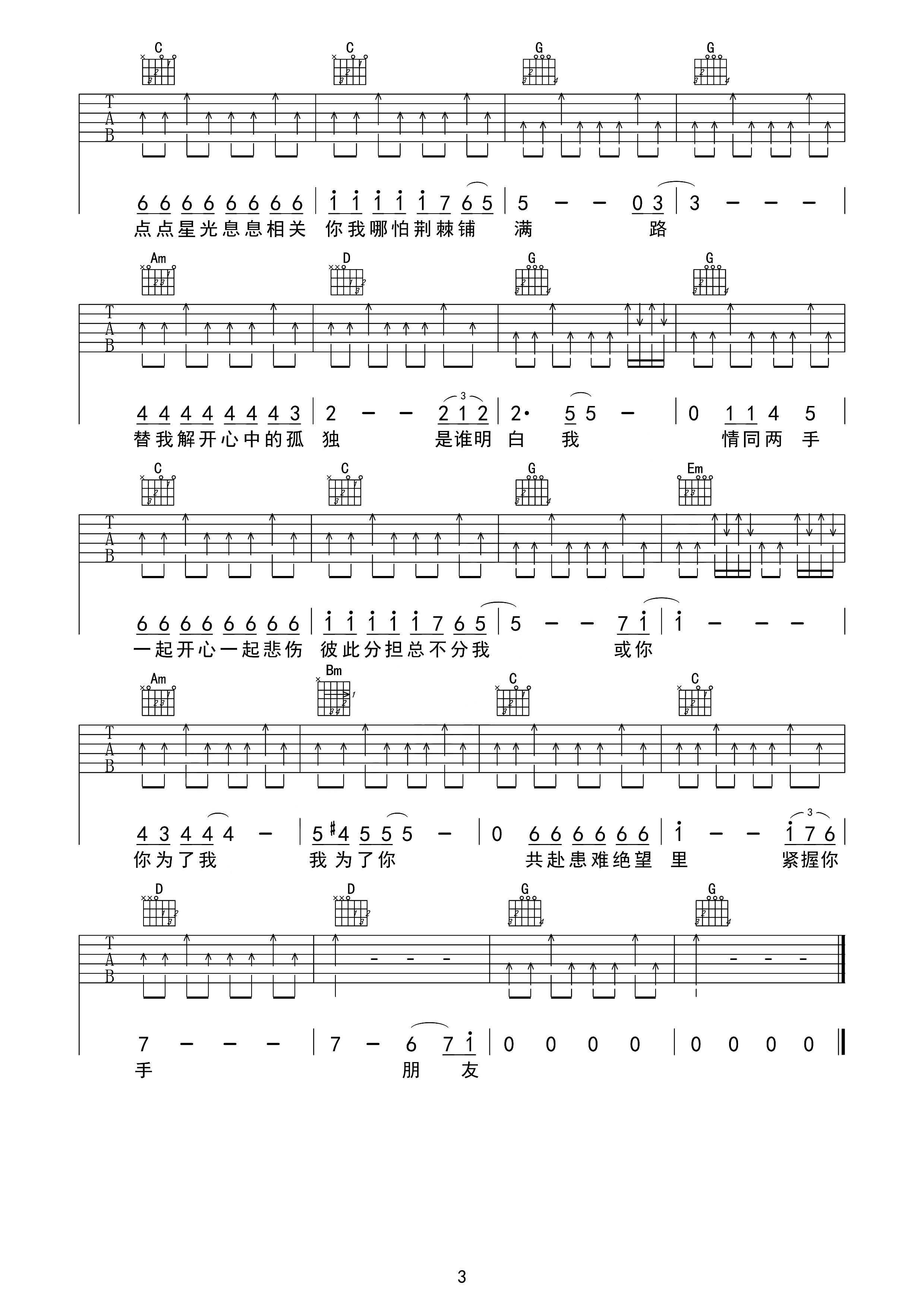 曲谱介绍: 谭咏麟《朋友》吉他弹唱谱,采用D调指法编配,共有3张高清图谱。