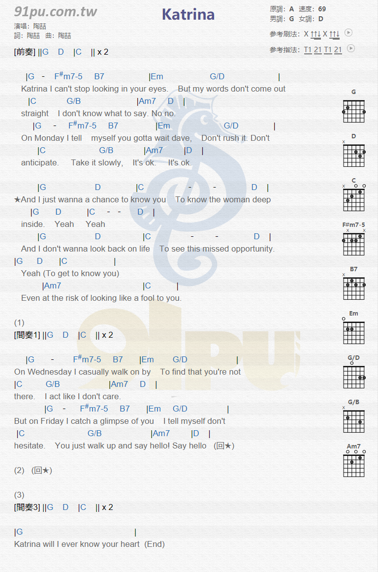 曲谱介绍: 陶喆《Katrina》吉他弹唱谱,采用G调指法编配,共有1张高清图谱,免翻页排版设计。