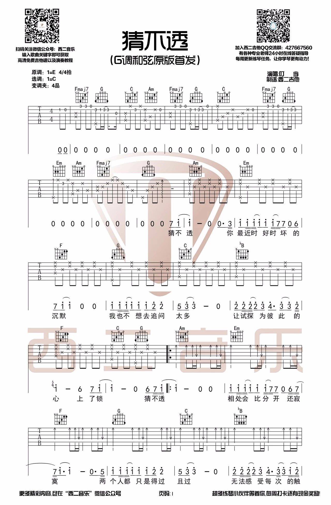 曲谱介绍: 丁当《猜不透》吉他弹唱谱,采用G调指法编配,共有3张高清图谱。