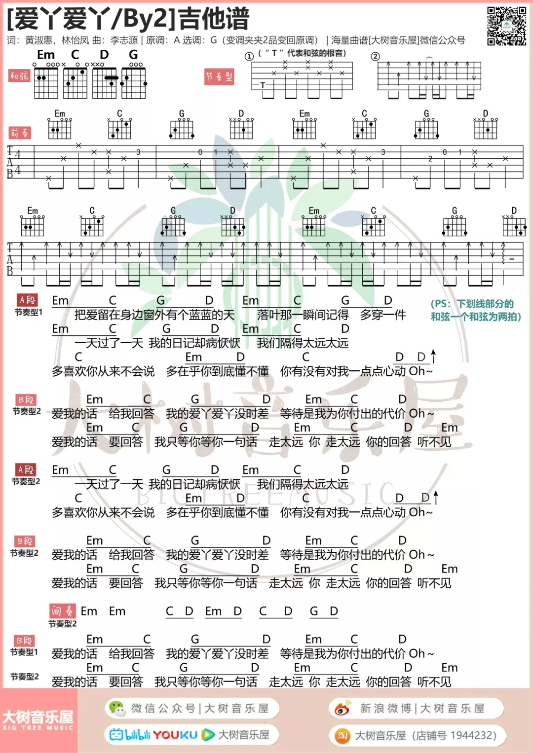 曲谱介绍: BY2《爱丫爱丫》吉他弹唱谱,采用G调指法编配,共有1张高清图谱,免翻页排版设计。