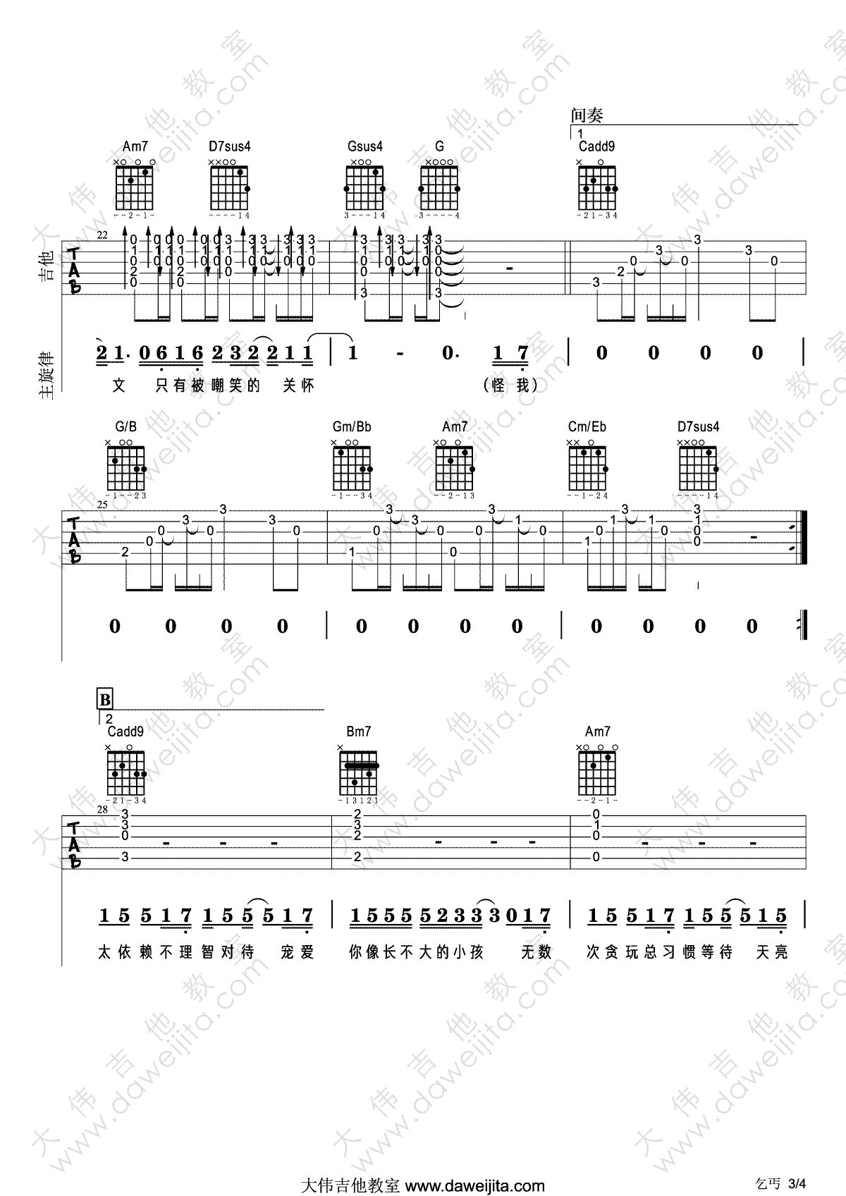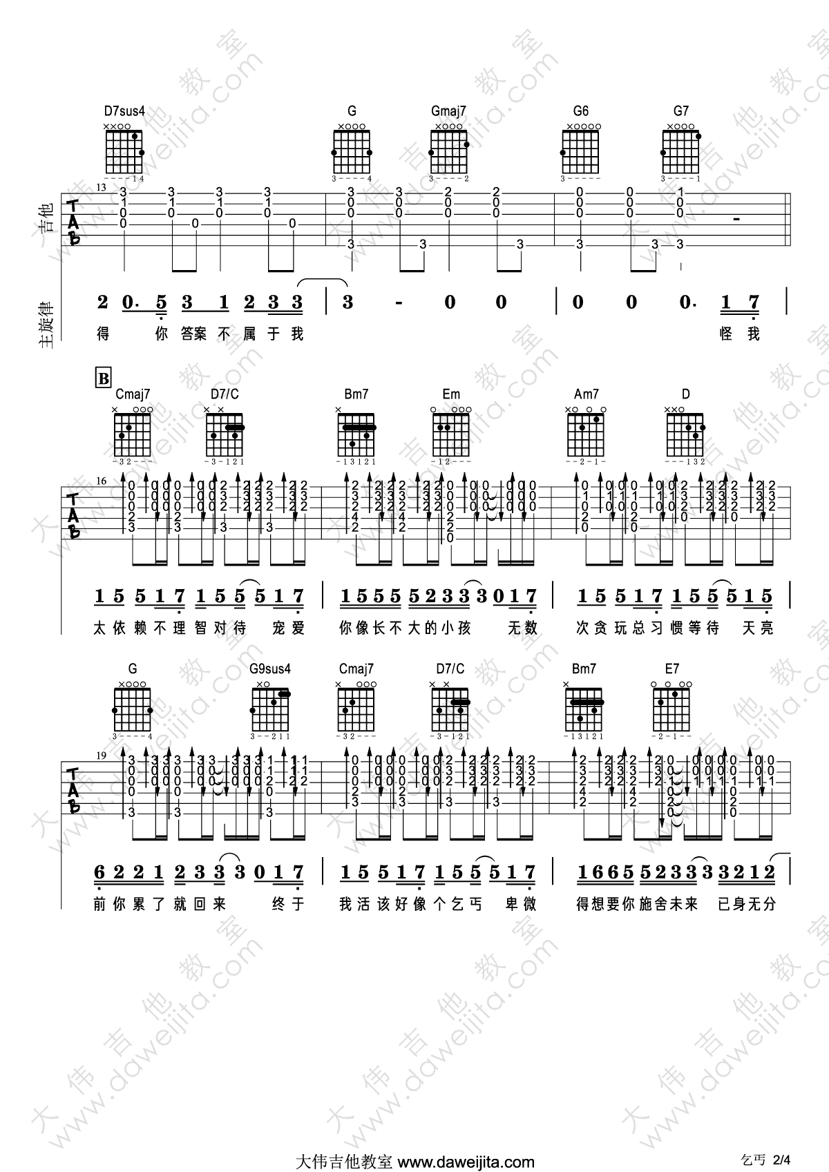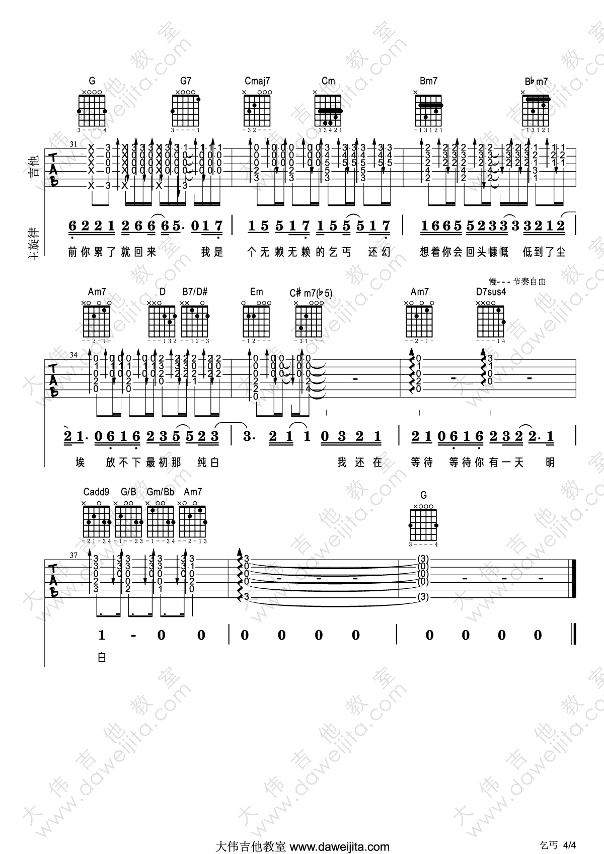 曲谱介绍: 摩登兄弟《乞丐》吉他弹唱谱,采用G调指法编配,共有4张高清图谱。