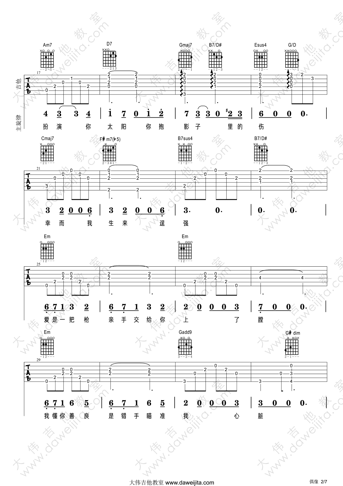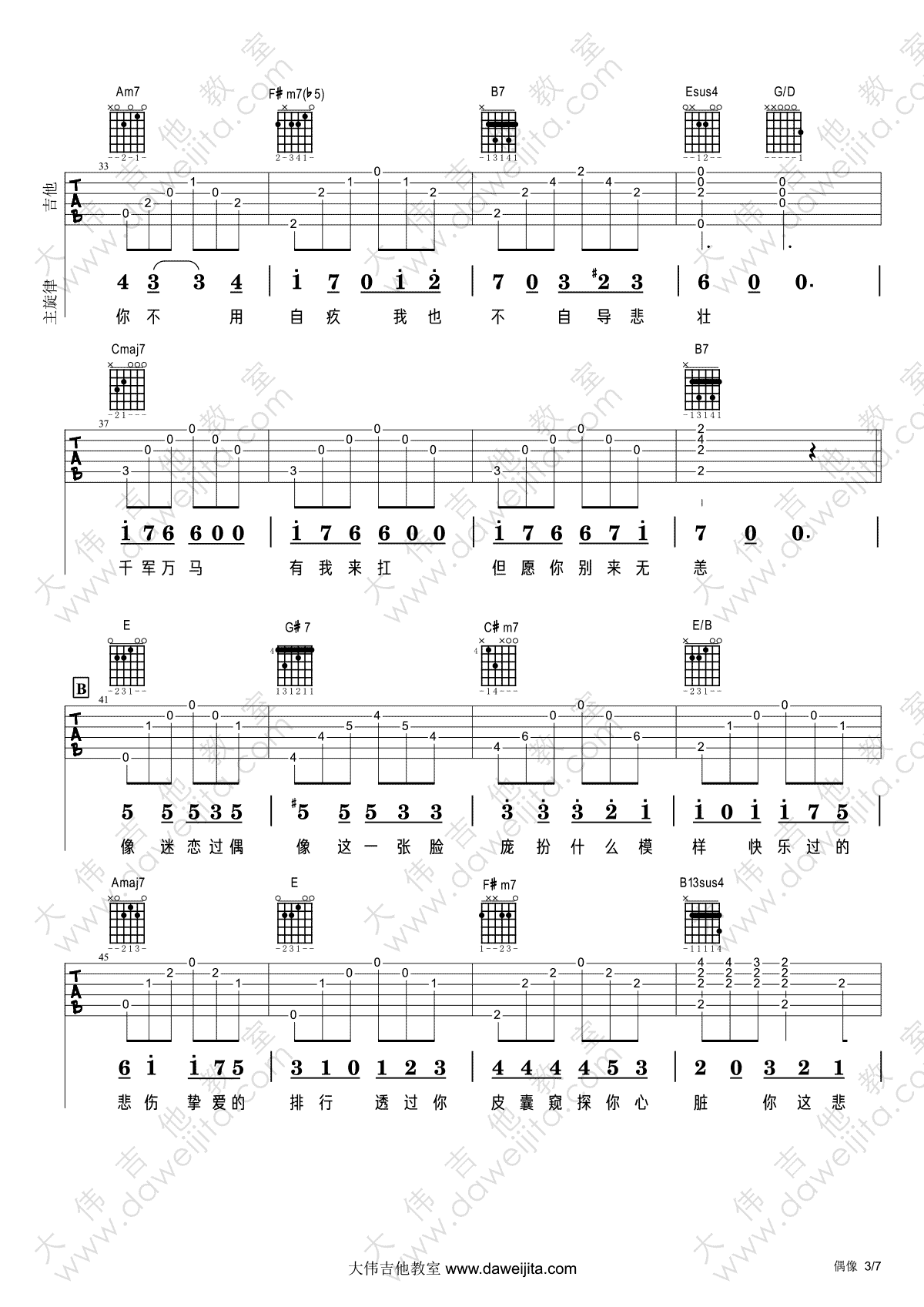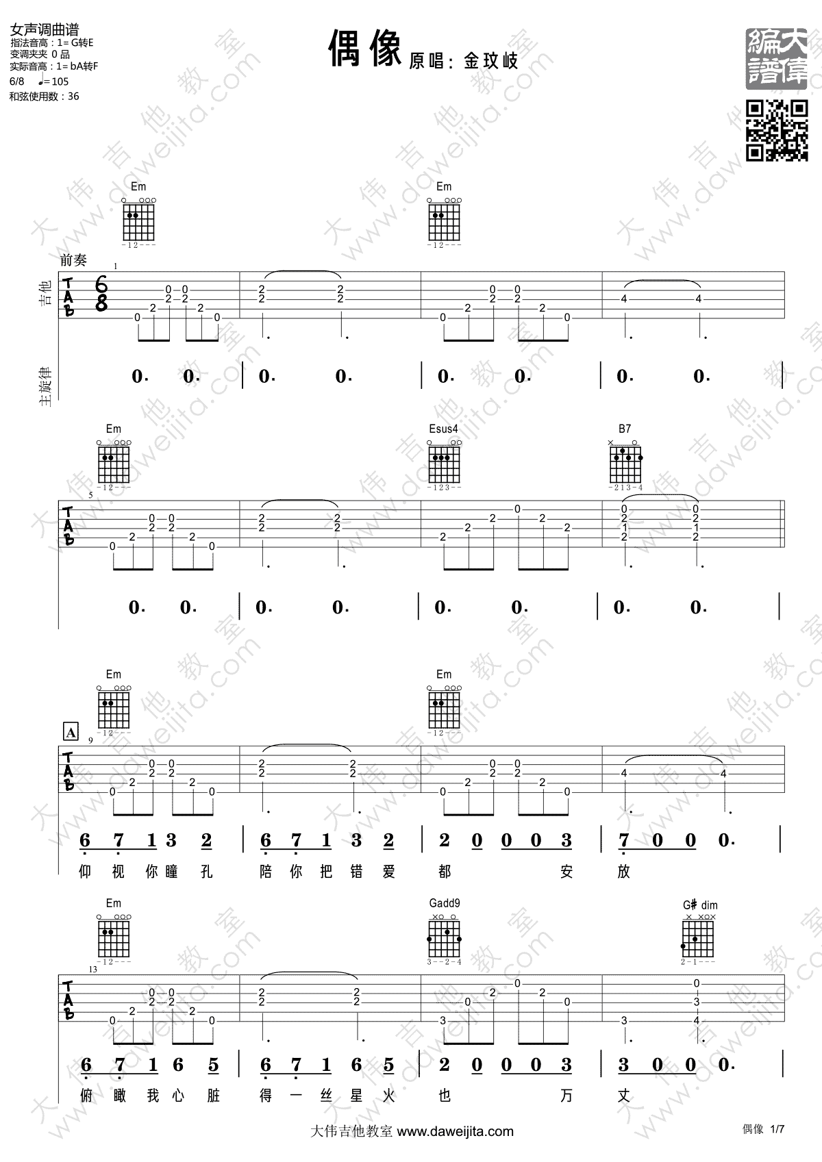 曲谱介绍: 金玟岐《偶像》吉他弹唱谱,采用G调指法编配,共有7张高清图谱。
