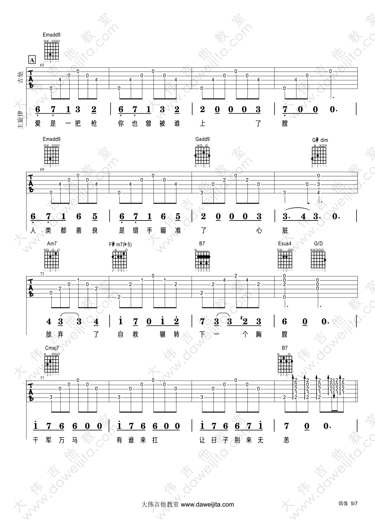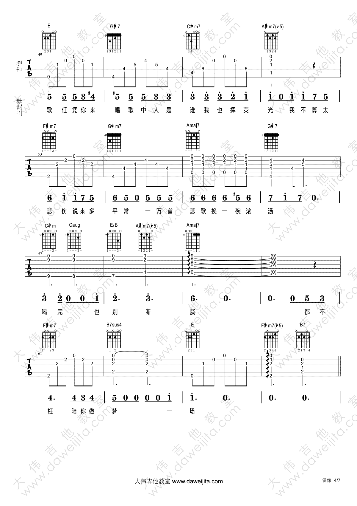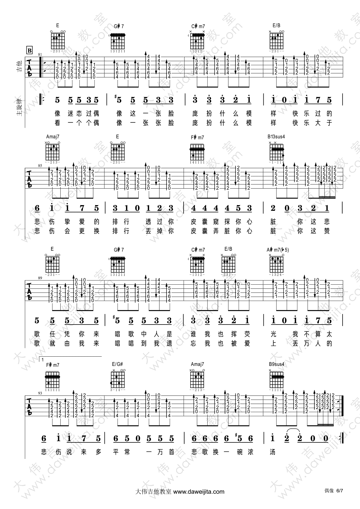 曲谱介绍: 金玟岐《偶像》吉他弹唱谱,采用G调指法编配,共有7张高清图谱。
