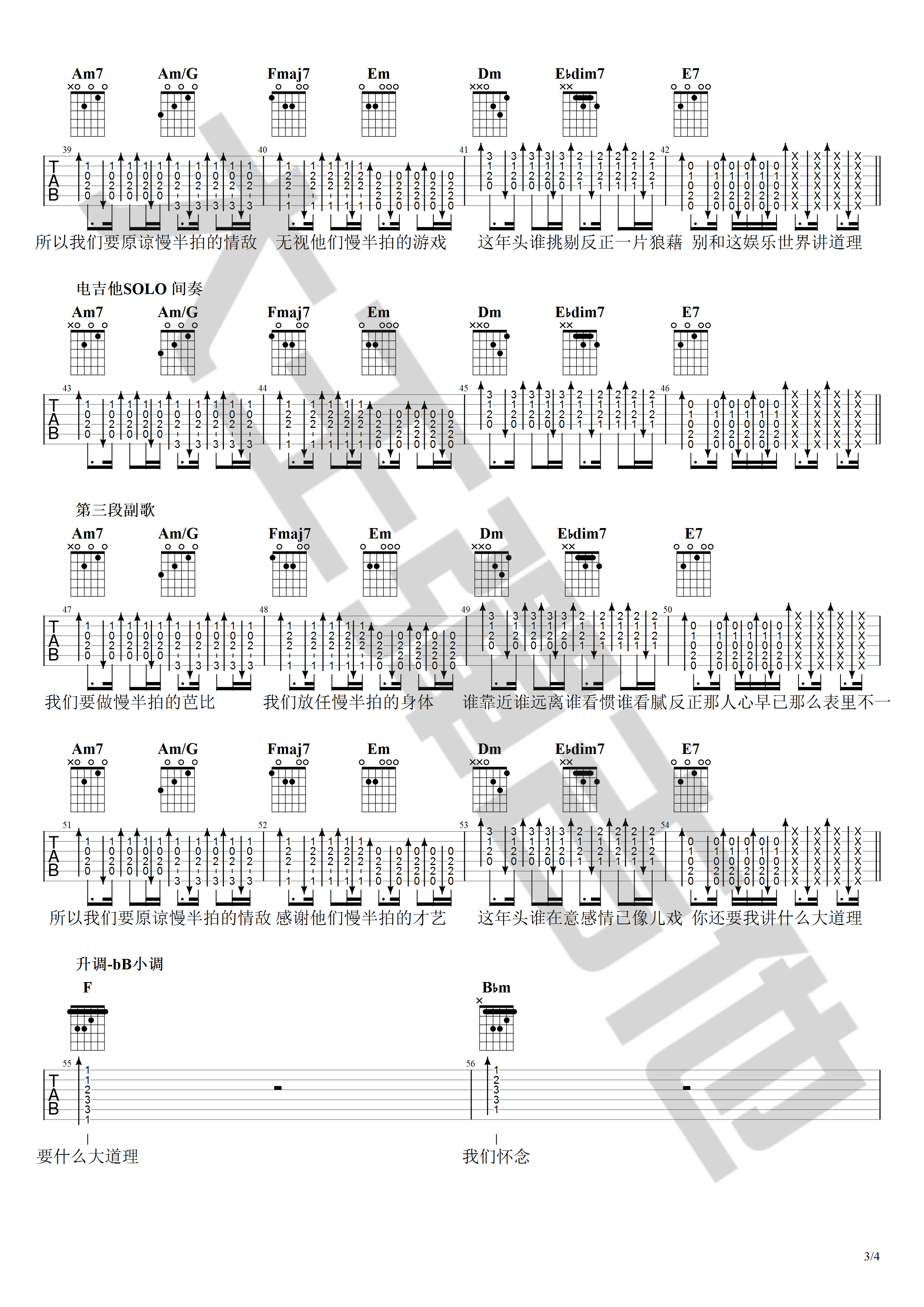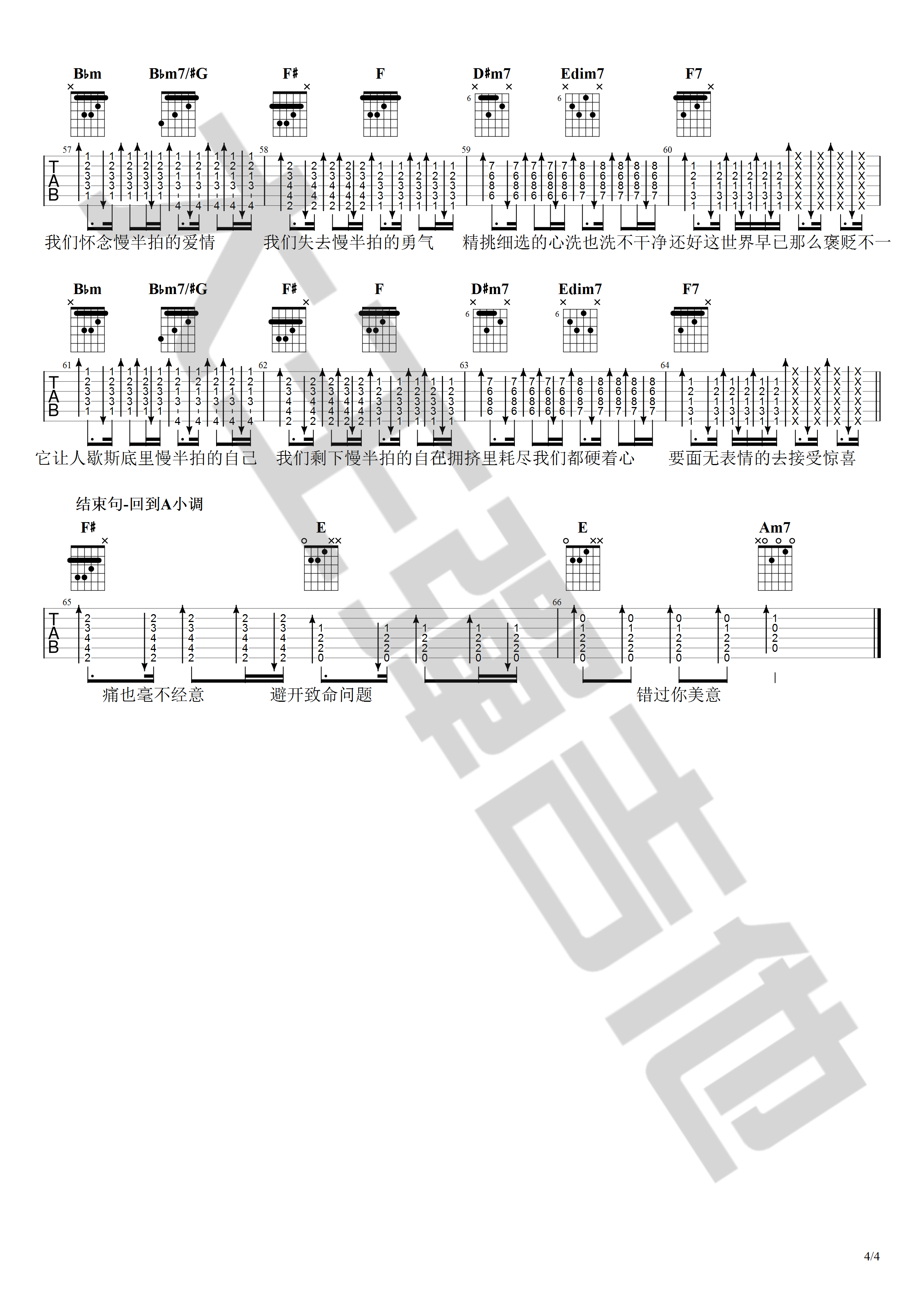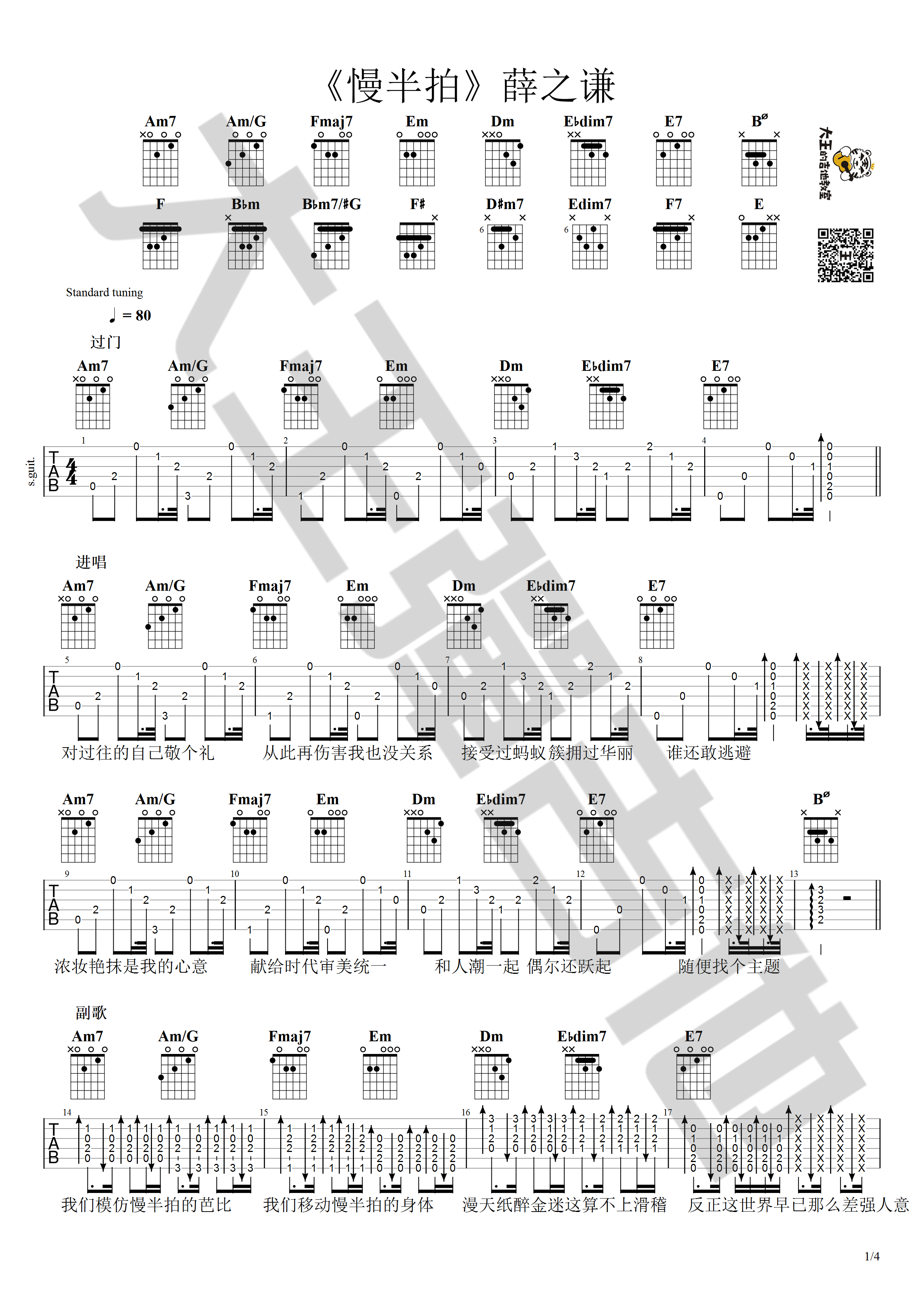 曲谱介绍: 薛之谦《慢半拍》吉他弹唱谱,采用A调指法编配,共有4张高清图谱。