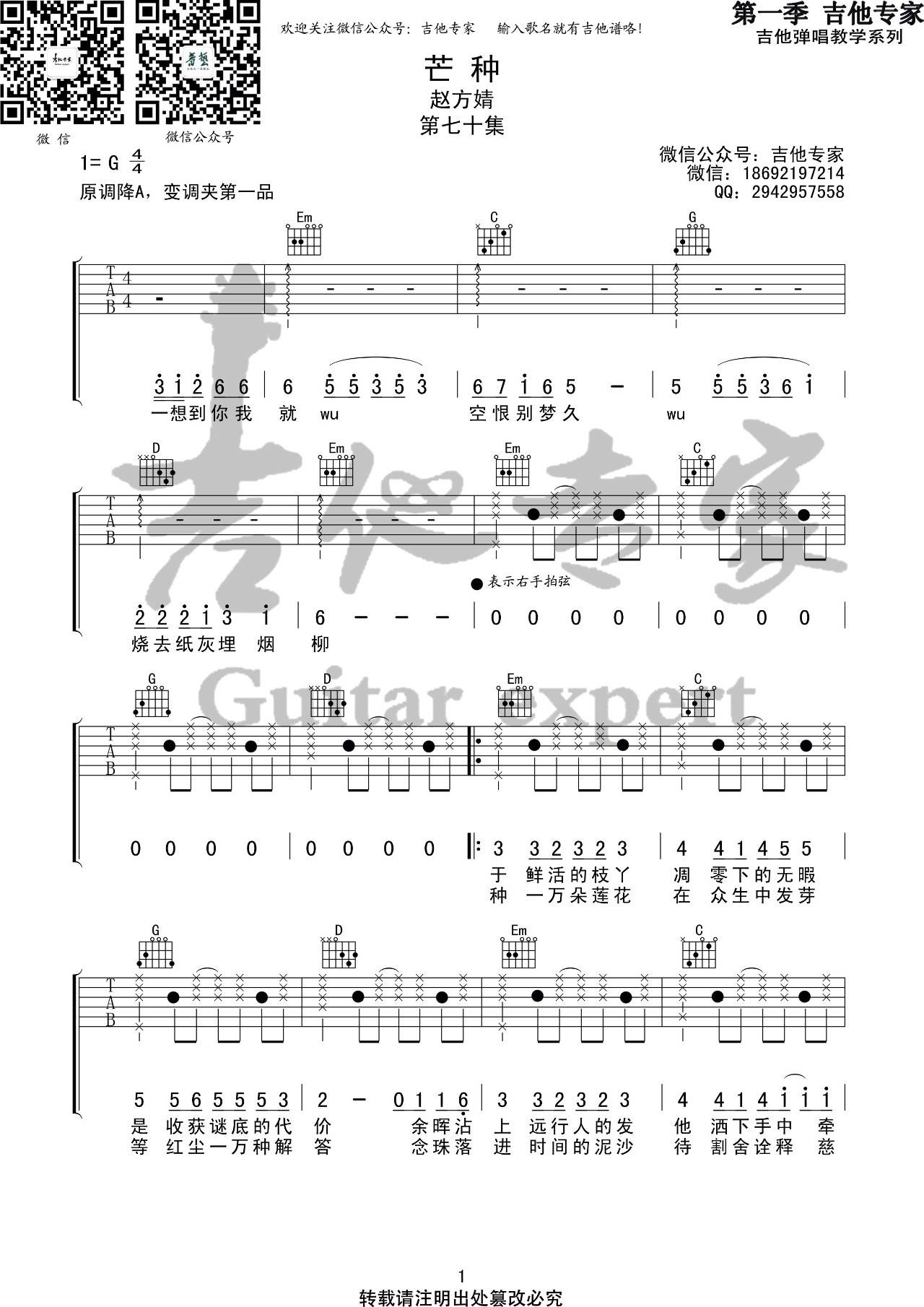 曲谱介绍: 赵方婧《芒种》吉他弹唱谱,采用G调指法编配,共有3张高清图谱。