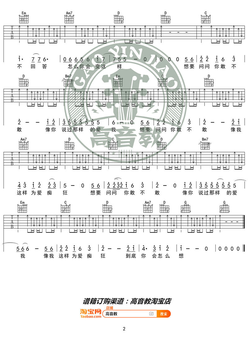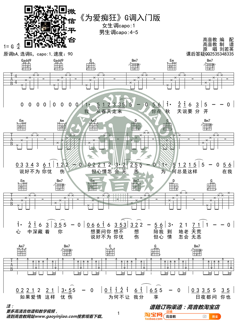 曲谱介绍: 金志文《为爱痴狂》吉他弹唱谱,采用G调指法编配,共有2张高清图谱,免翻页排版设计。