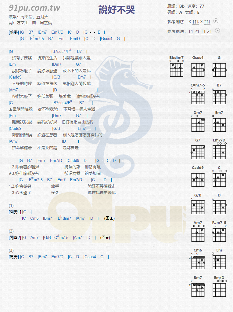 说好不哭吉他谱 - 周杰伦 - B调吉他弹唱谱