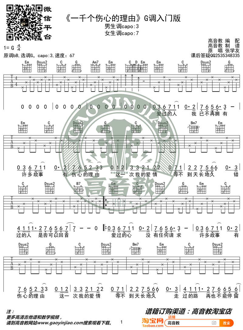 曲谱介绍: 张学友《一千个伤心的理由》吉他弹唱谱,采用G调指法编配,共有2张高清图谱,免翻页排版设计。