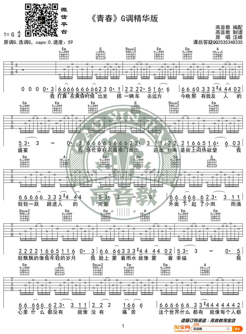 曲谱介绍: 汪峰《青春》吉他弹唱谱,采用G调指法编配,共有2张高清图谱,免翻页排版设计。
