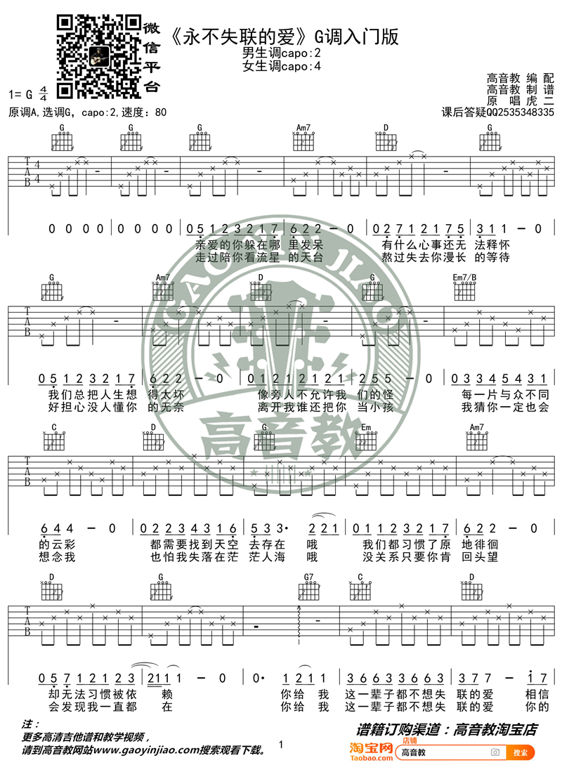 曲谱介绍: 虎二《永不失联的爱》吉他弹唱谱,采用G调指法编配,共有2张高清图谱,免翻页排版设计。