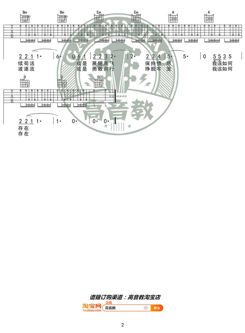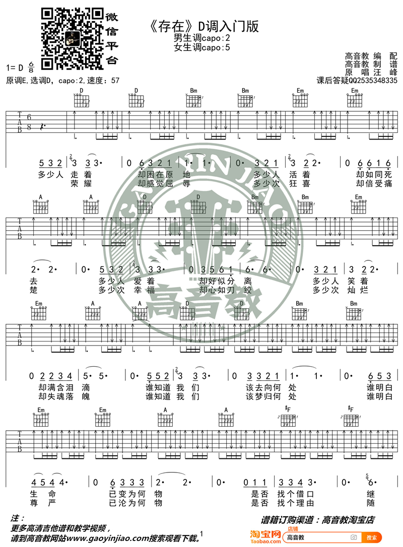 曲谱介绍: 汪峰《存在》吉他弹唱谱,采用D调指法编配,共有2张高清图谱,免翻页排版设计。