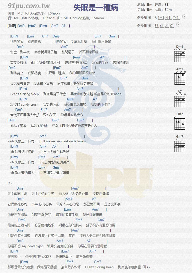 曲谱介绍: MC,HotDog《失眠是一种病》吉他弹唱谱,采用B调指法编配,共有2张高清图谱,免翻页排版设计。