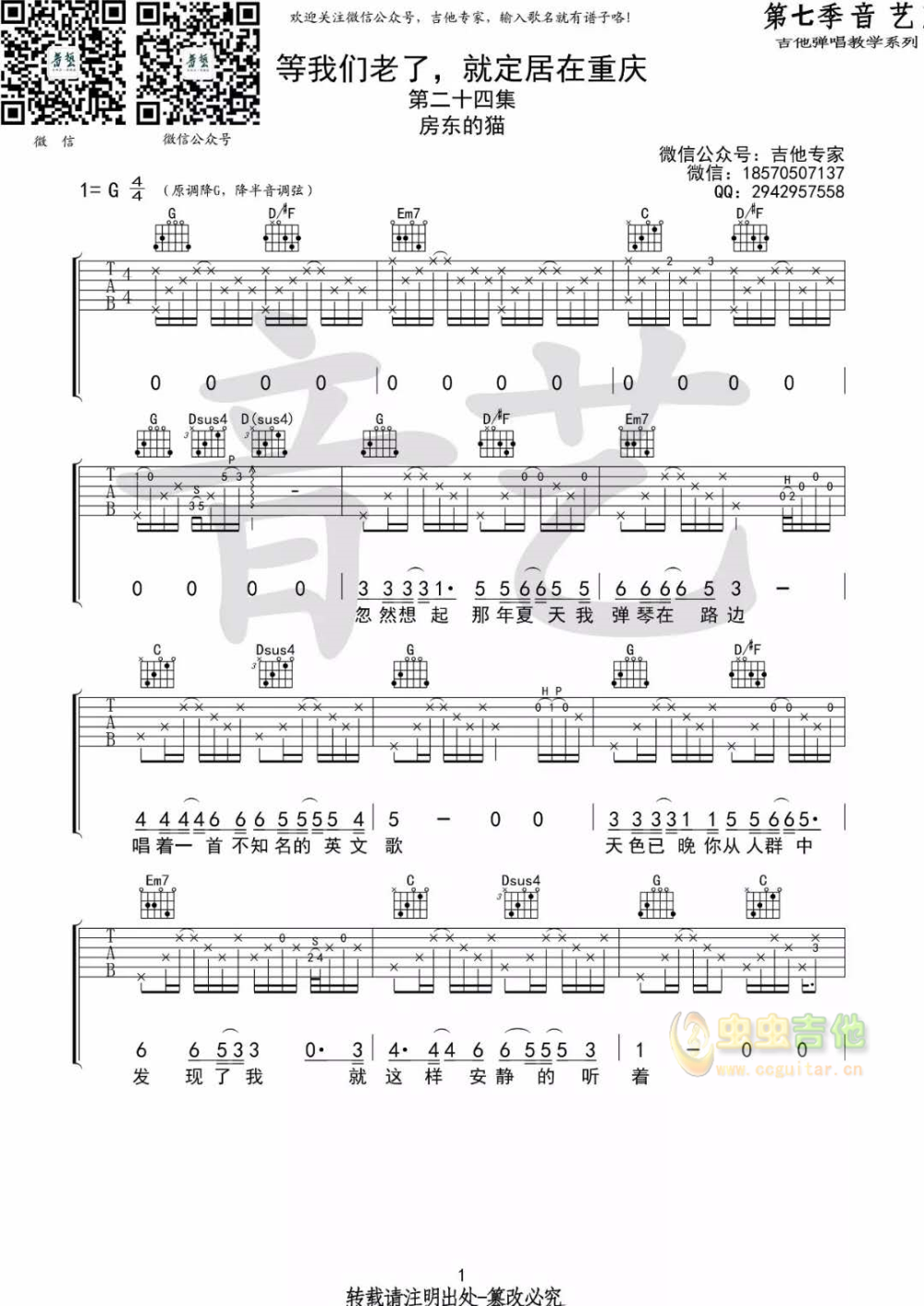 曲谱介绍: 房东的猫《等我们老了,就定居在重庆》吉他弹唱谱,采用G调指法编配,共有3张高清图谱。