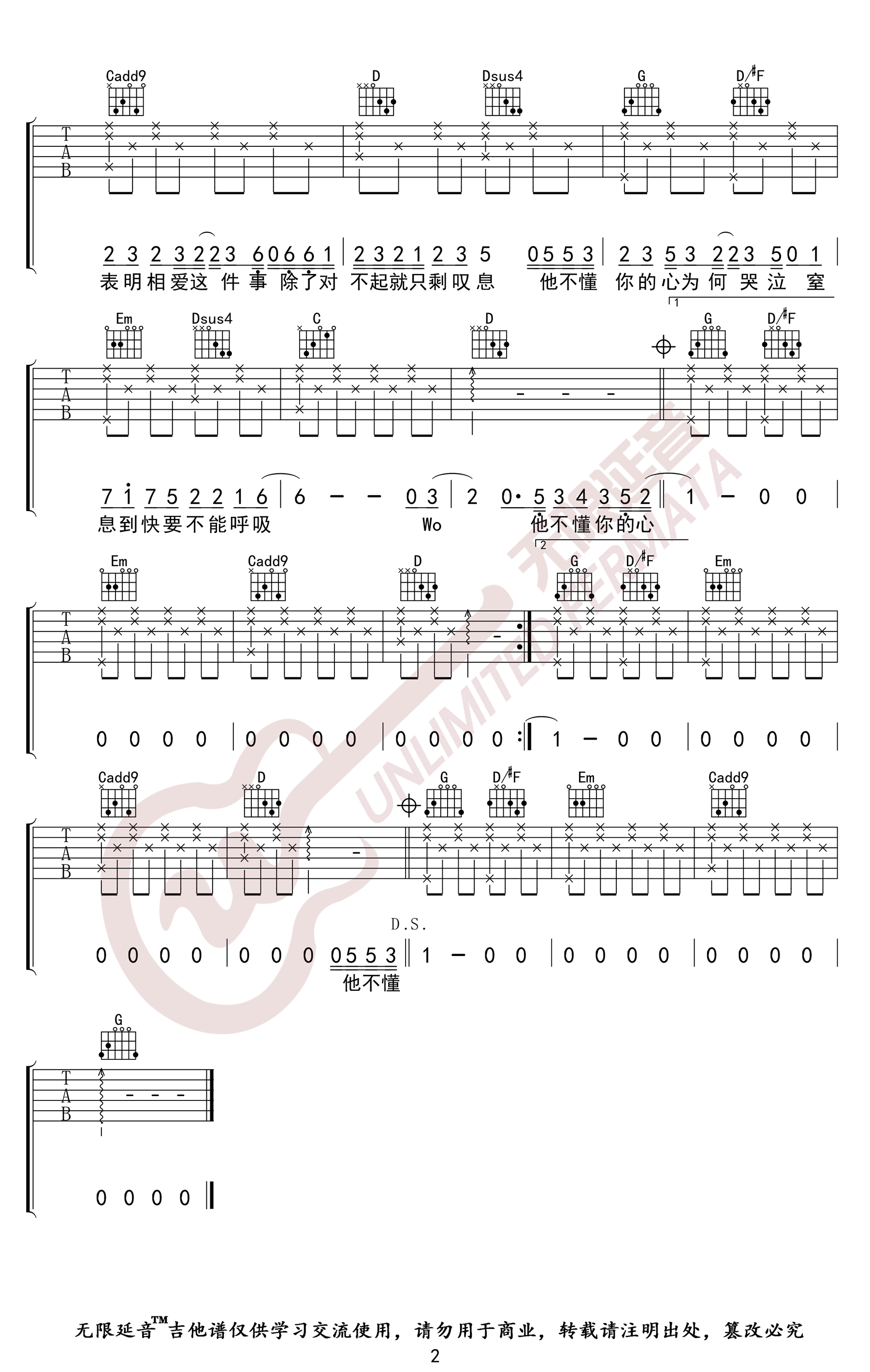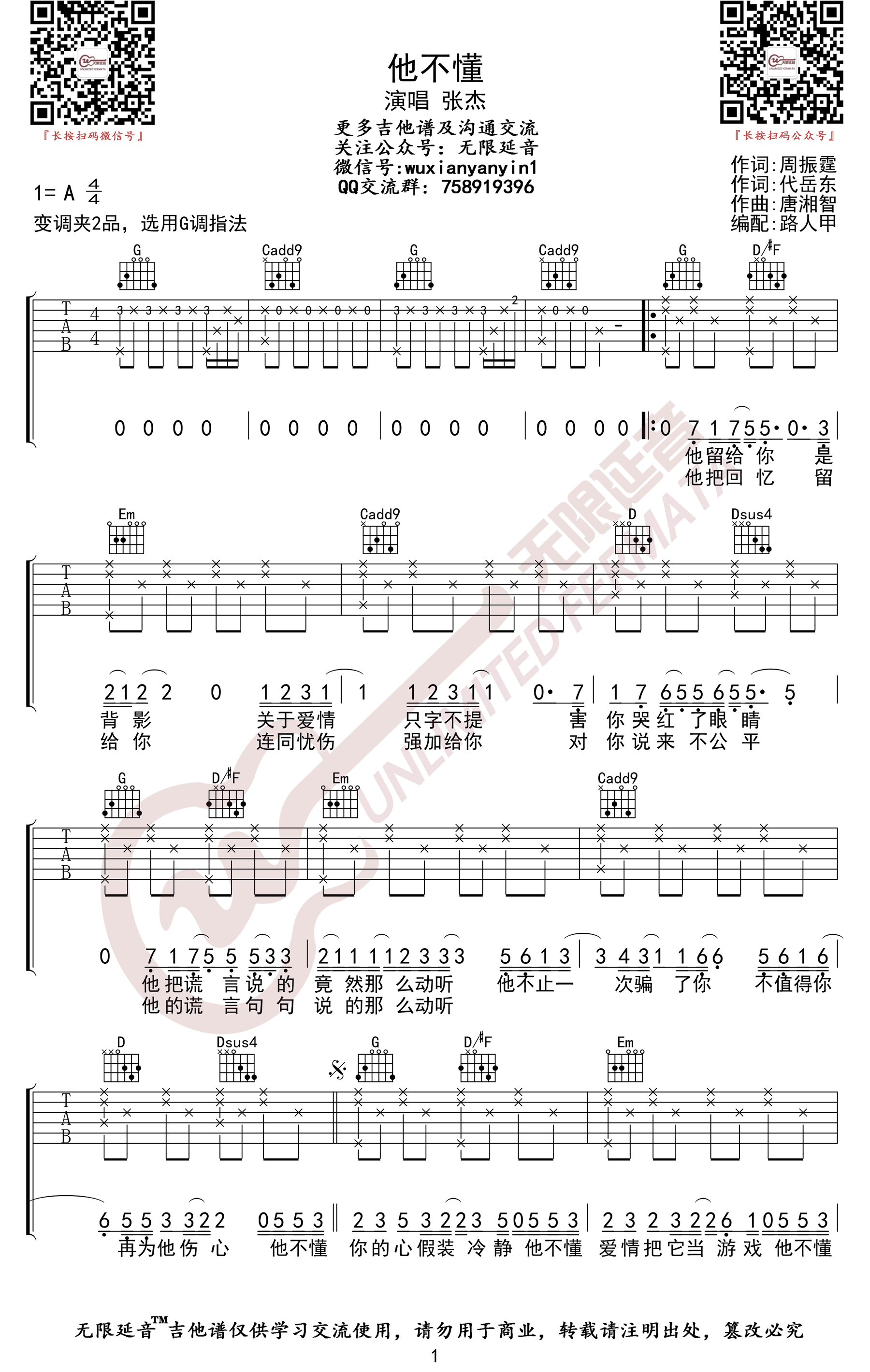 曲谱介绍: 张杰《他不懂》吉他弹唱谱,采用A调指法编配,共有2张高清图谱,免翻页排版设计。