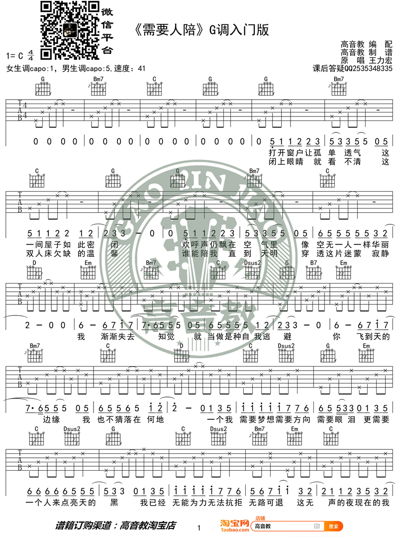 曲谱介绍: 王力宏《需要人陪》吉他弹唱谱,采用G调指法编配,共有2张高清图谱,免翻页排版设计。