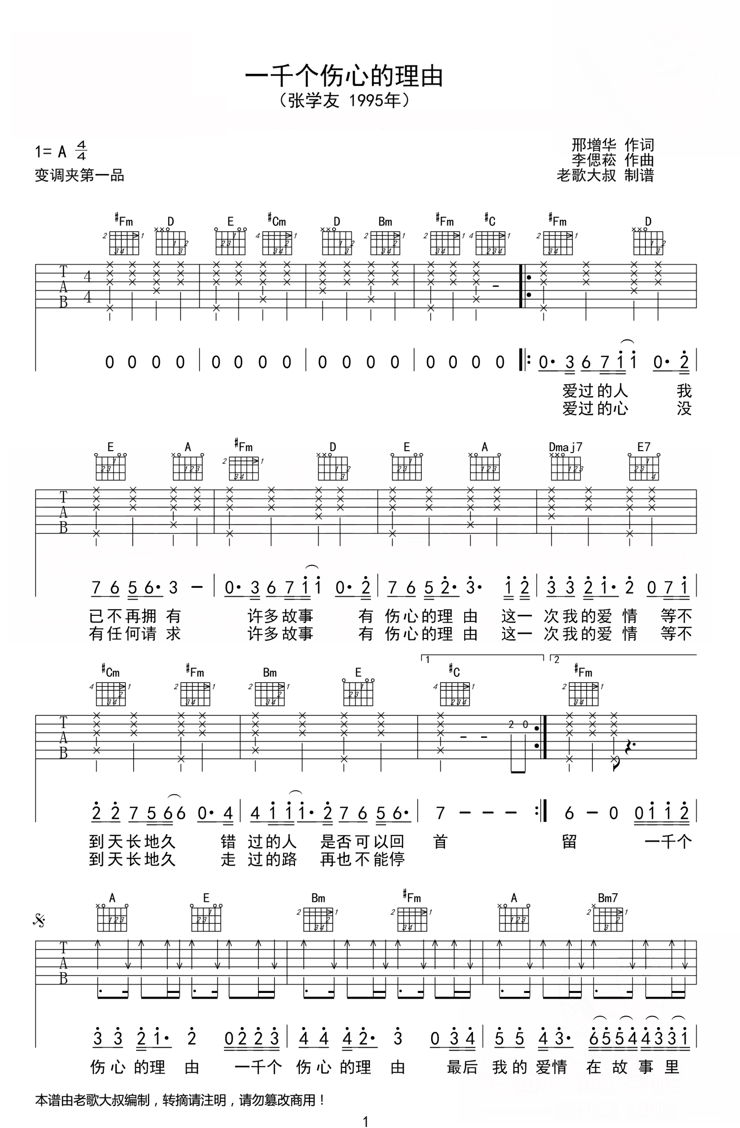 曲谱介绍: 一千个伤心的理由吉他谱,张学友演唱的一首经典老歌,唱尽了无数人的绵绵忧伤。一千个伤心的理由六线谱,A调弹唱谱,变调夹夹一品。生活里总能找出很多不如意的事情,每个人也有着各种伤心的原因,或大或小或远或近,只多不少还永不雷同。但是人生也有无数个需要自己打起精神,勇往直前的理由,心怀希望,相信阴霾既散阳光终会出现的时候。