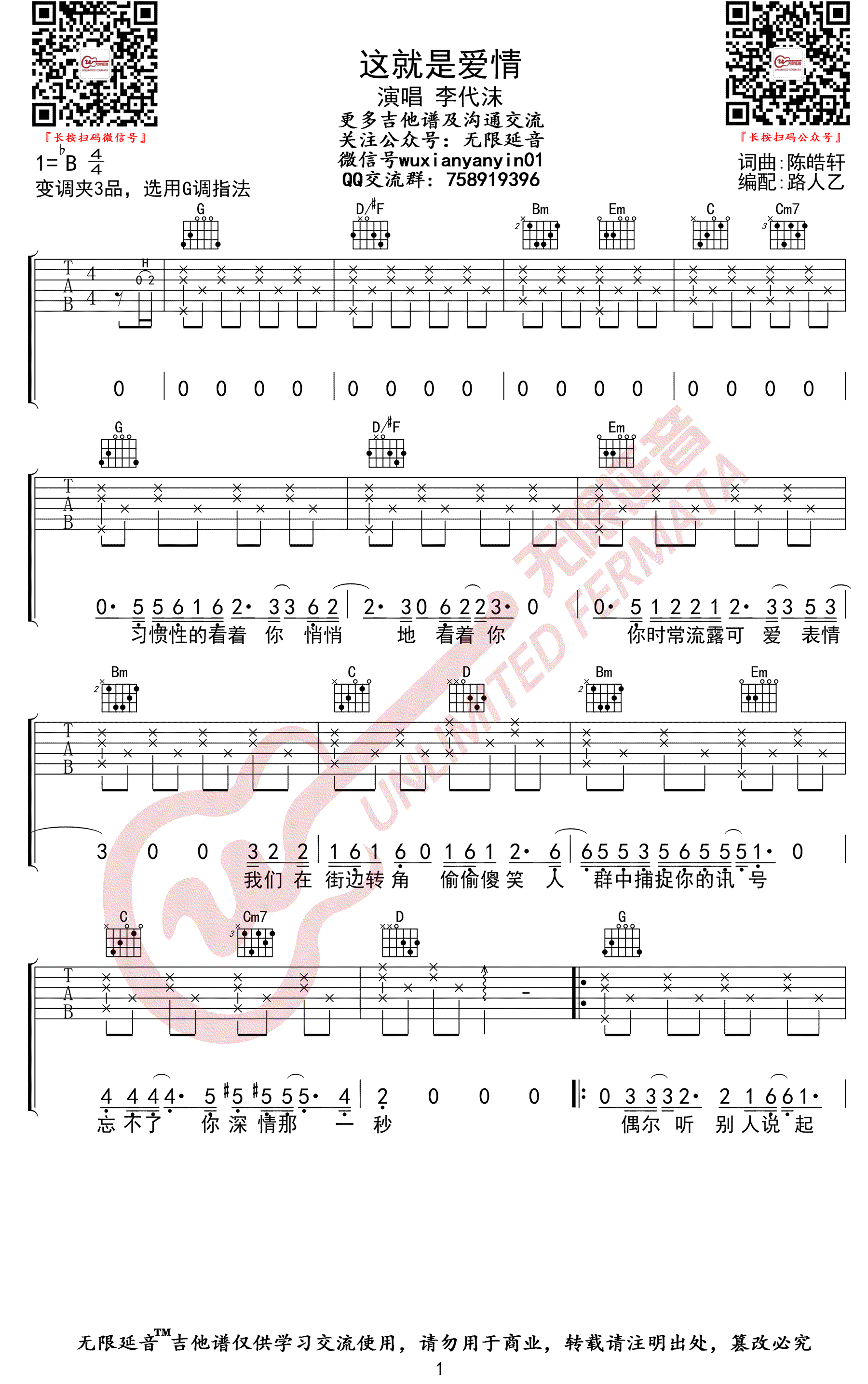 曲谱介绍: 李代沫《这就是爱情》吉他弹唱谱,采用G调指法编配,共有3张高清图谱。