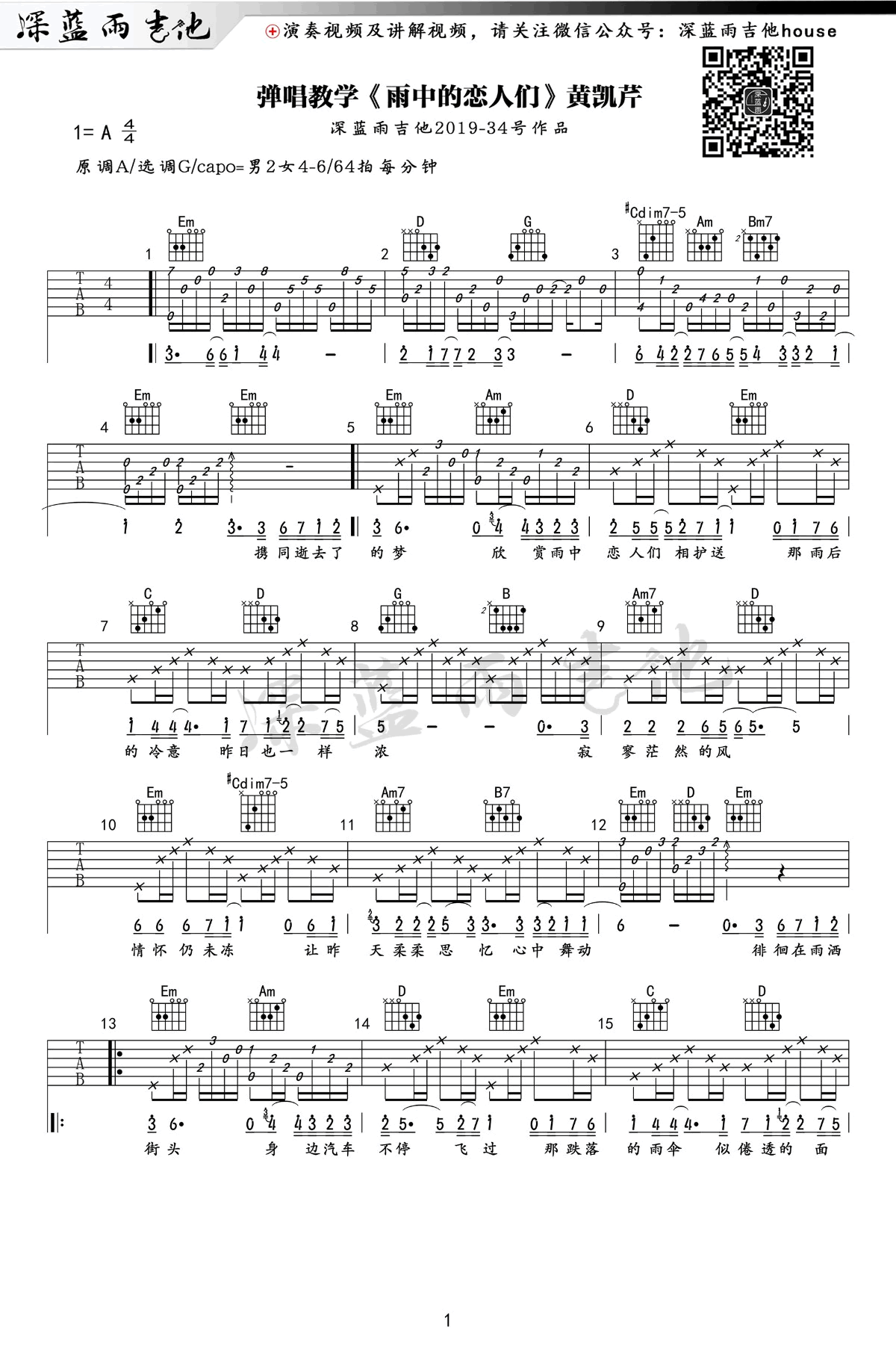 曲谱介绍: 黄凯芹《雨中的恋人们》吉他弹唱谱,采用A调指法编配,共有3张高清图谱。
