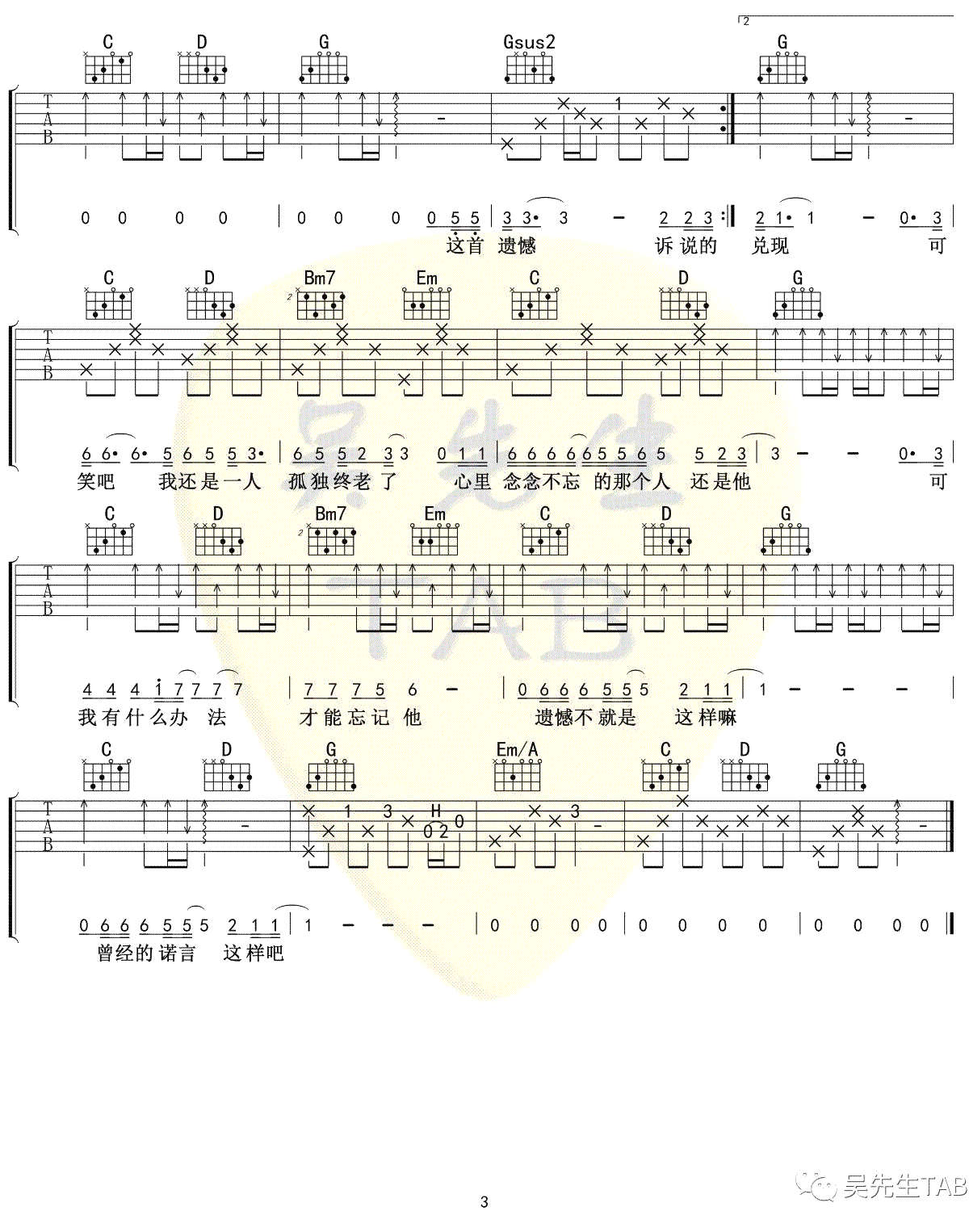 曲谱介绍: 王佳杨《遗憾》吉他弹唱谱,采用G调指法编配,共有3张高清图谱。