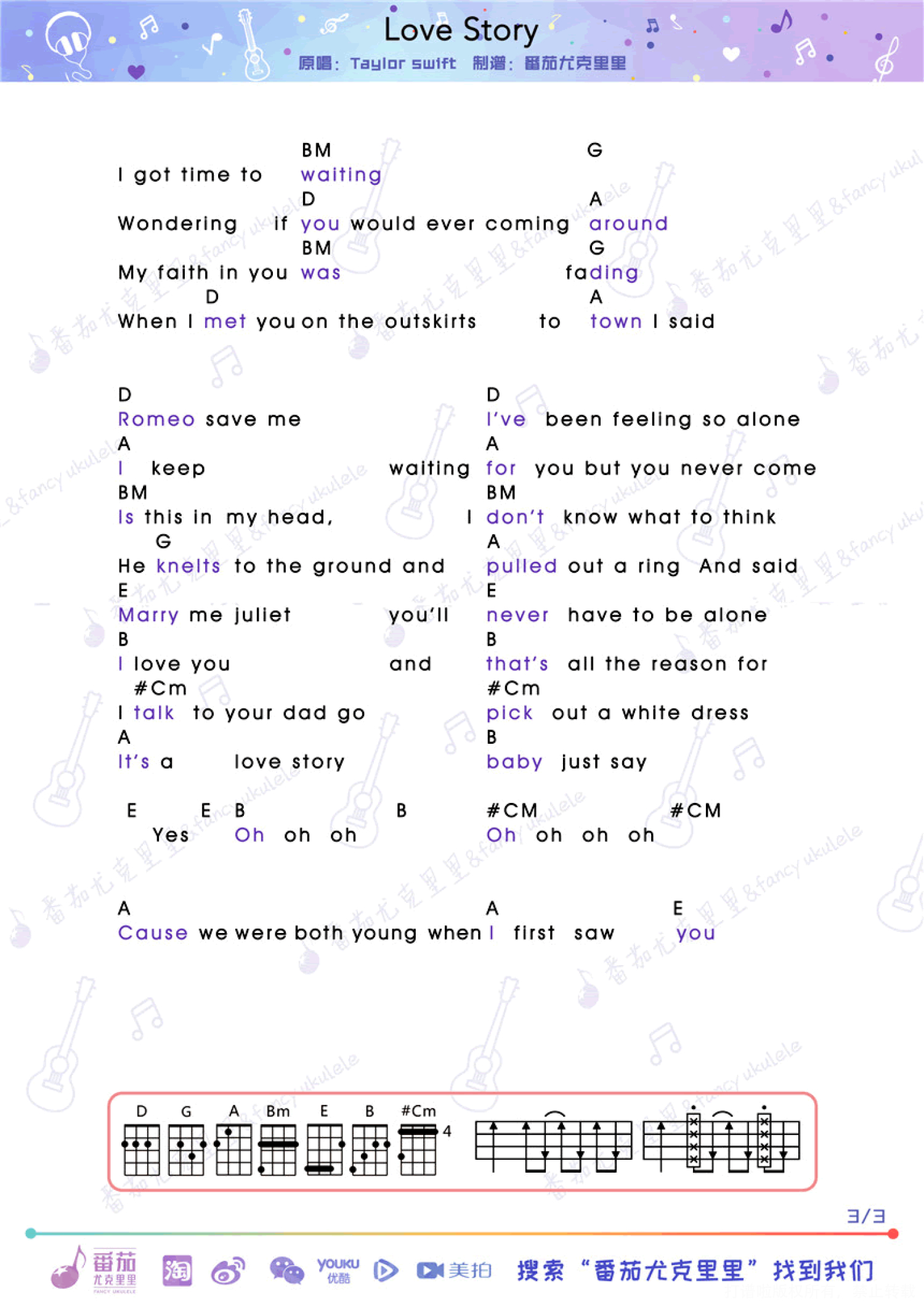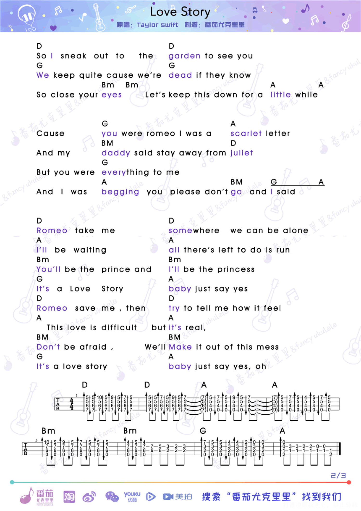 曲谱介绍: LoveStoryukulele谱,TaylorSwift演唱的一首乡村民谣英文歌曲,LoveStory尤克里里谱,带前奏间奏四线谱