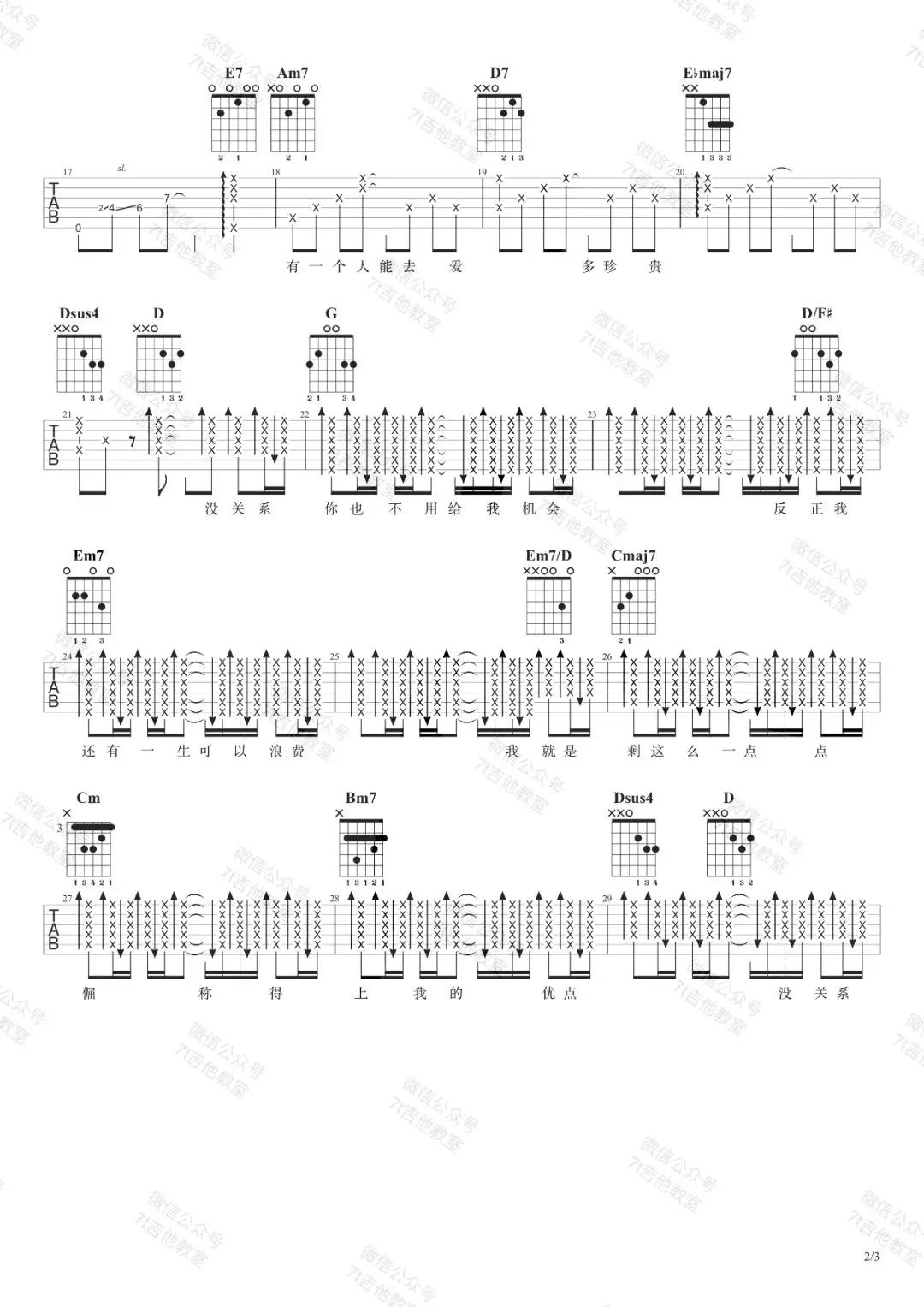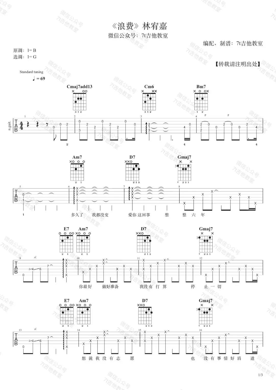 曲谱介绍: 林宥嘉《浪费》吉他弹唱谱,采用G调指法编配,共有3张高清图谱。