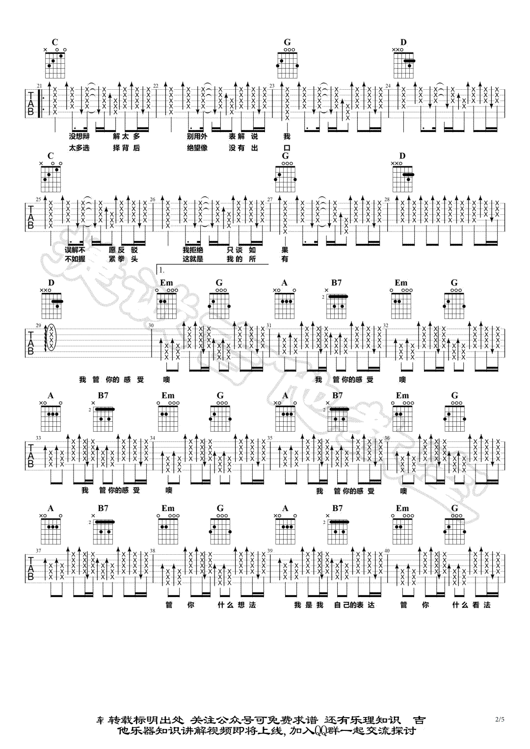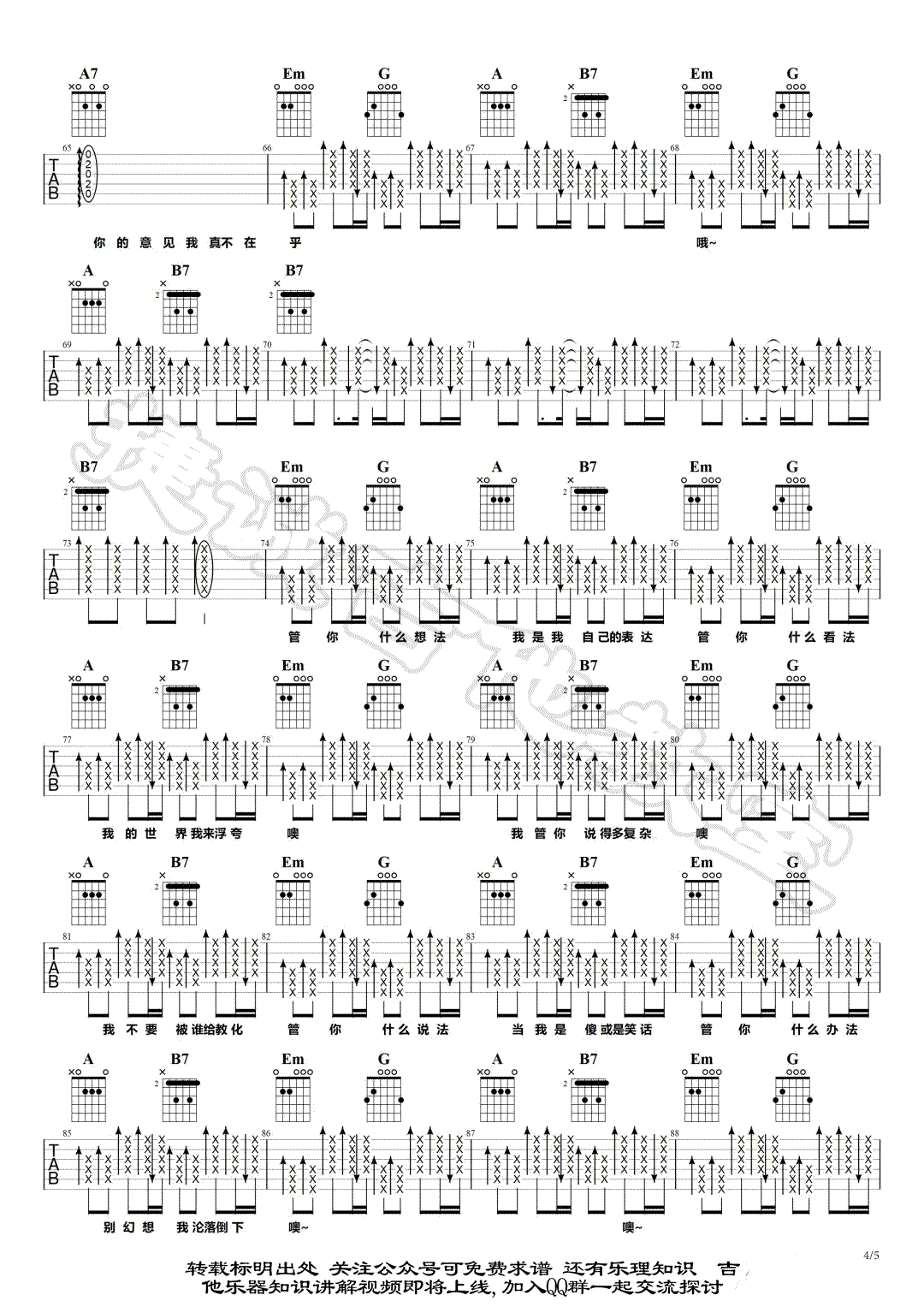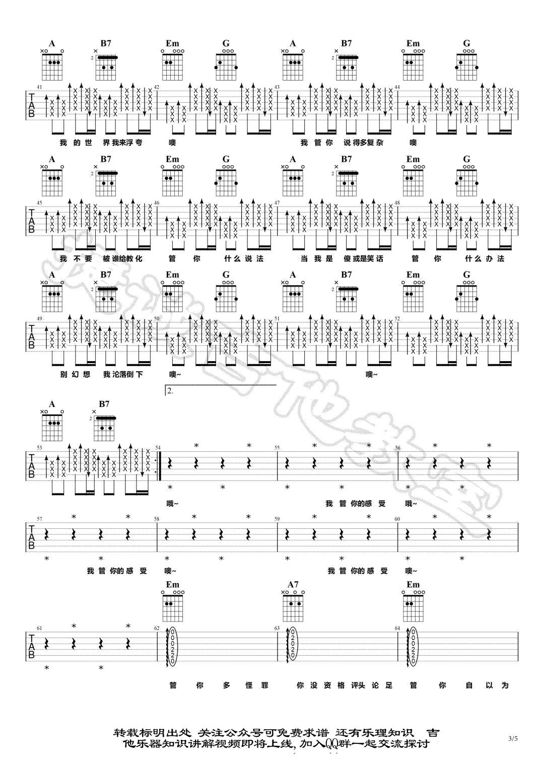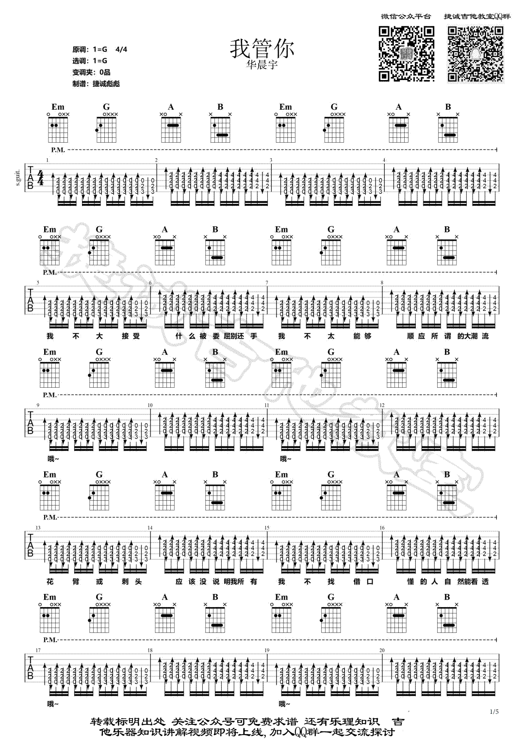 曲谱介绍: 华晨宇《我管你》吉他弹唱谱,采用G调指法编配,共有5张高清图谱。