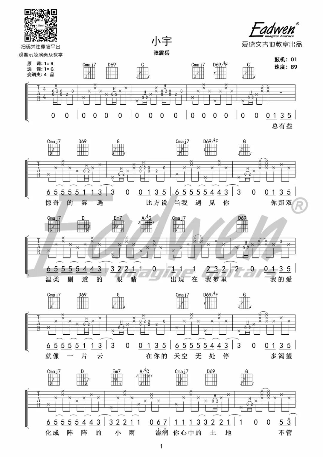 曲谱介绍: 张震岳《小宇》吉他弹唱谱,采用G调指法编配,共有4张高清图谱。