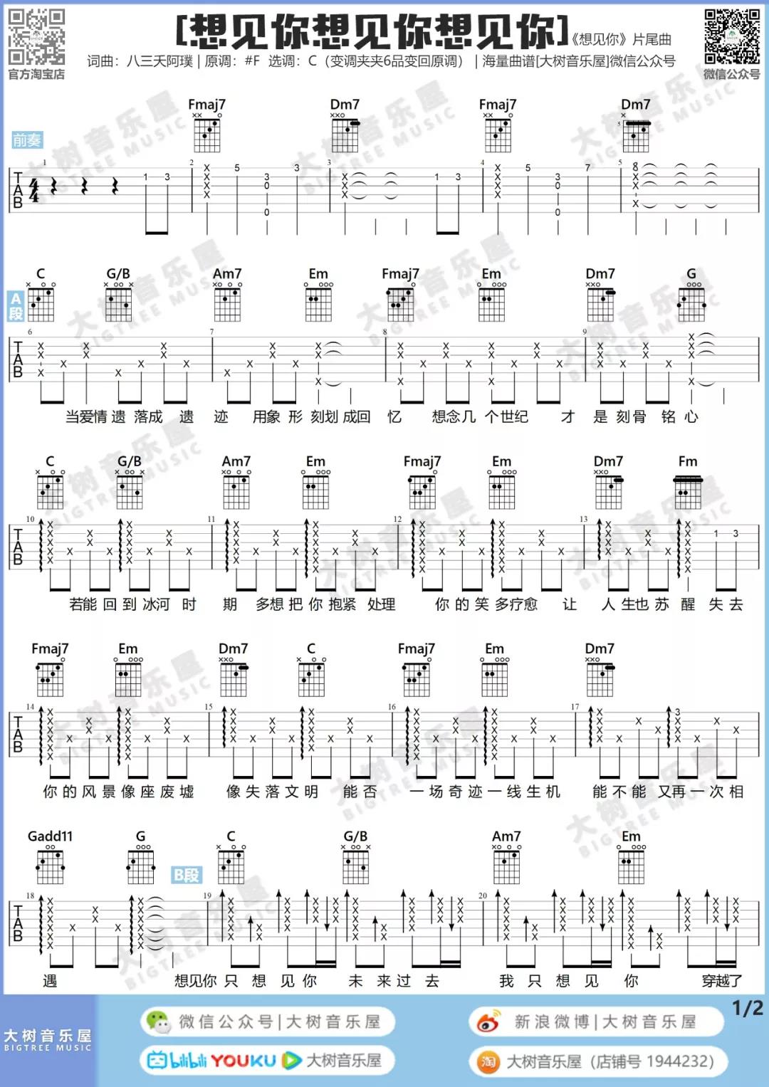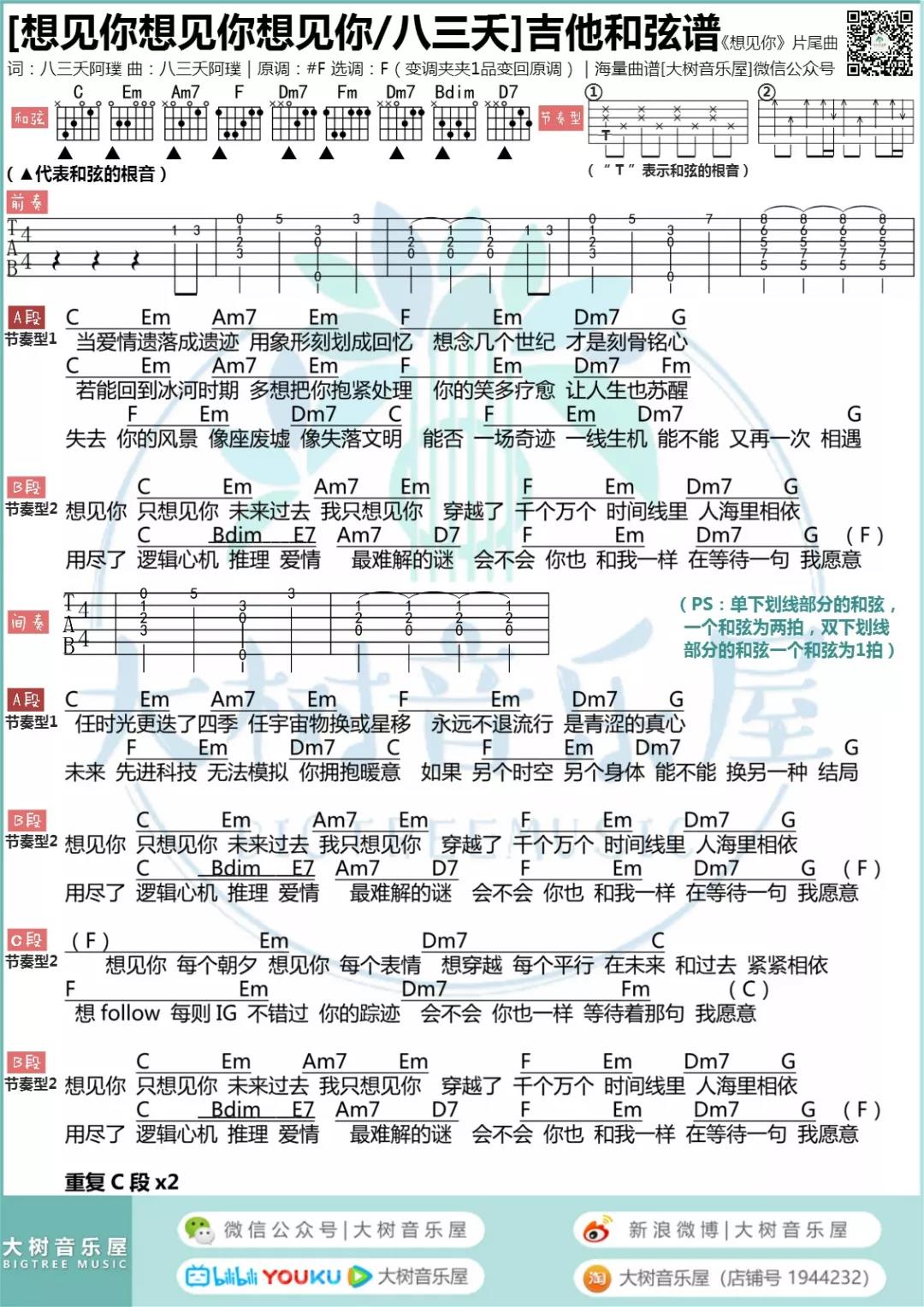 曲谱介绍: 八三夭《想见你想见你想见你》吉他弹唱谱,采用F调指法编配,共有3张高清图谱。