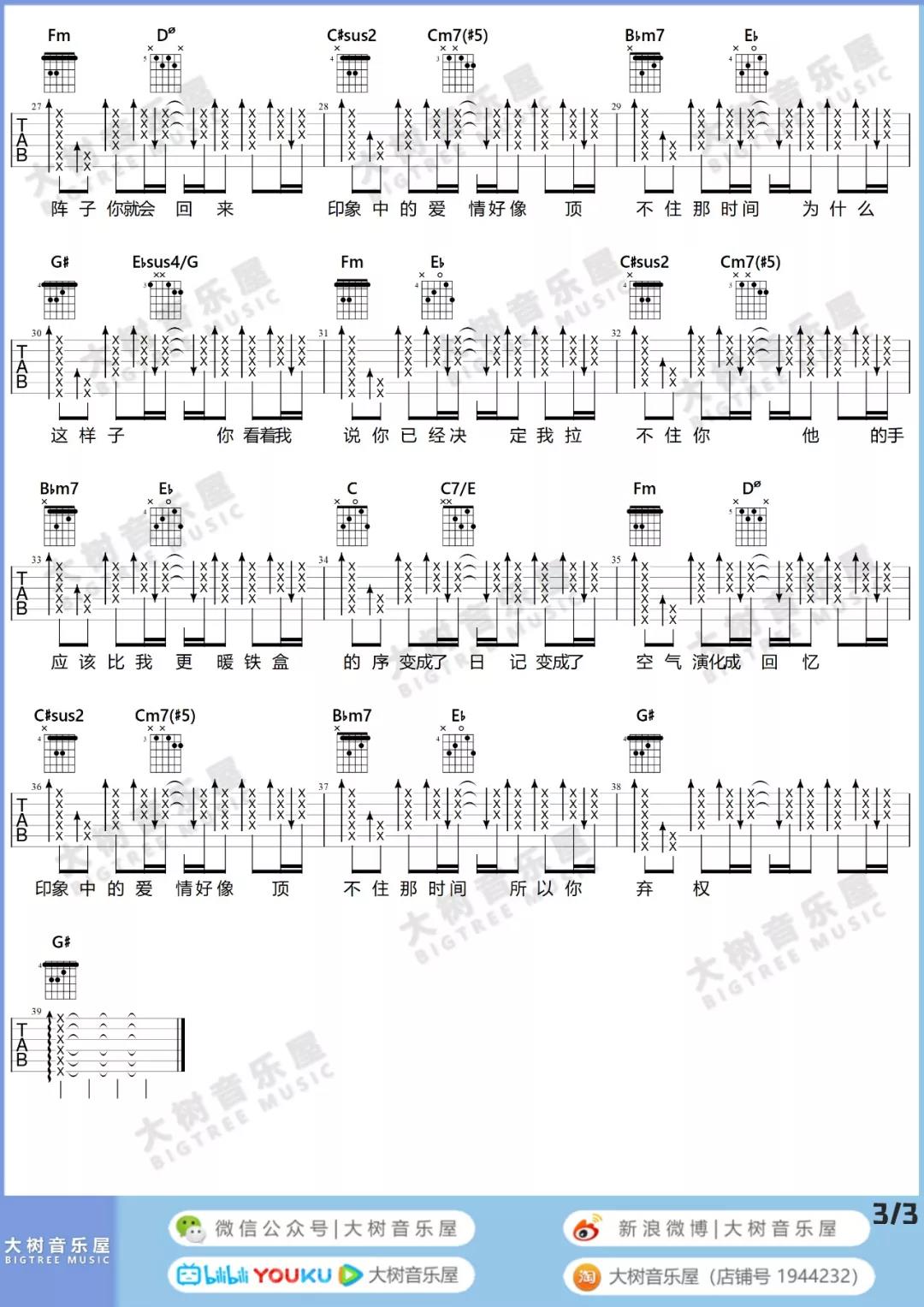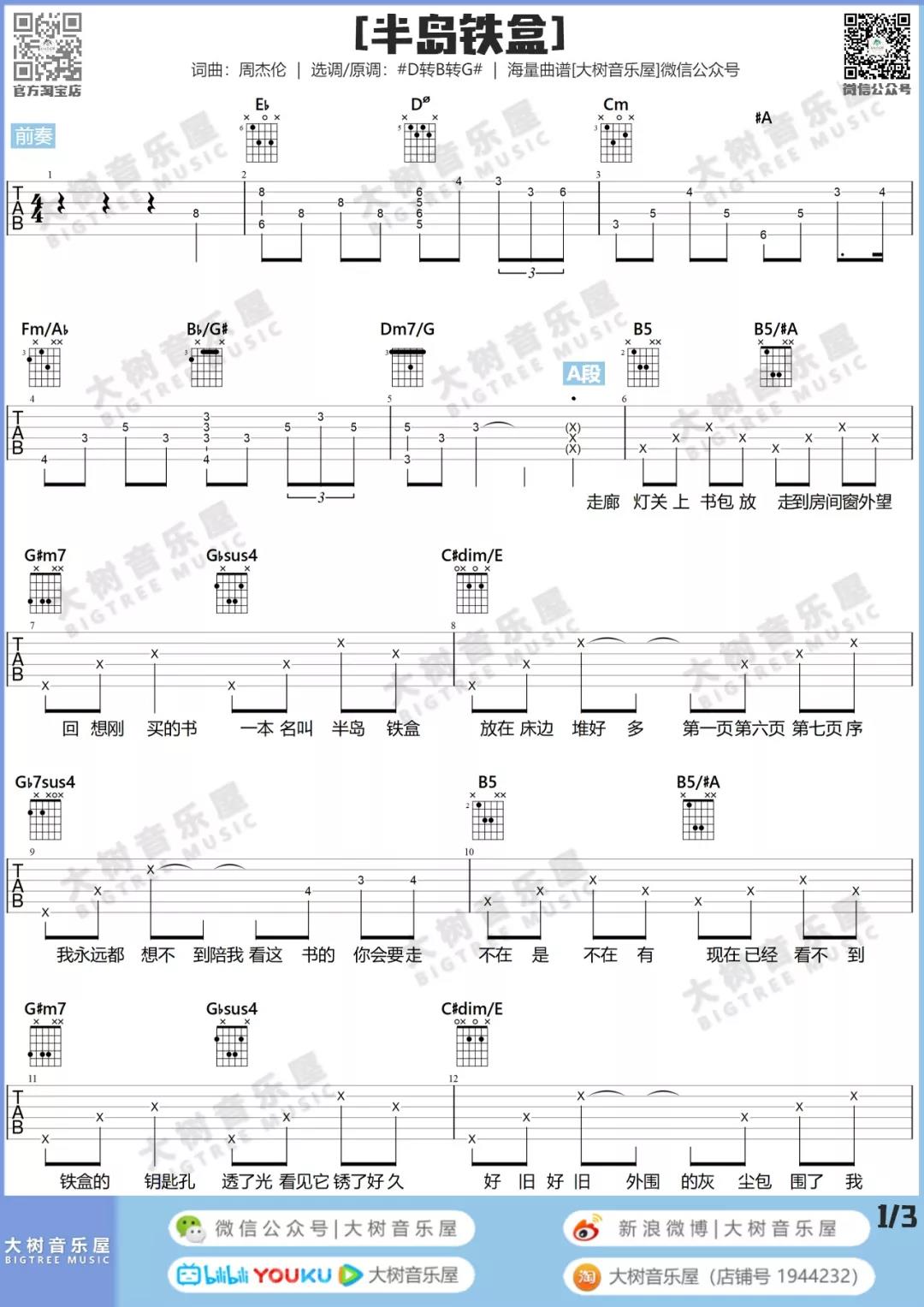 曲谱介绍: 周杰伦《半岛铁盒》吉他弹唱谱,采用G调指法编配,共有3张高清图谱。