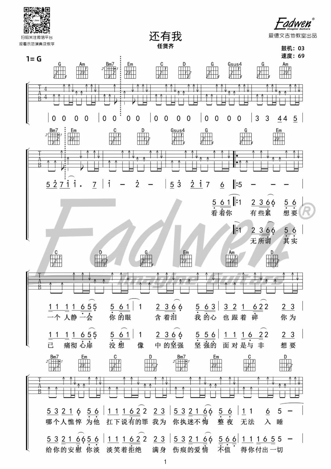 曲谱介绍: 任贤齐《还有我》吉他弹唱谱,采用G调指法编配,共有2张高清图谱,免翻页排版设计。