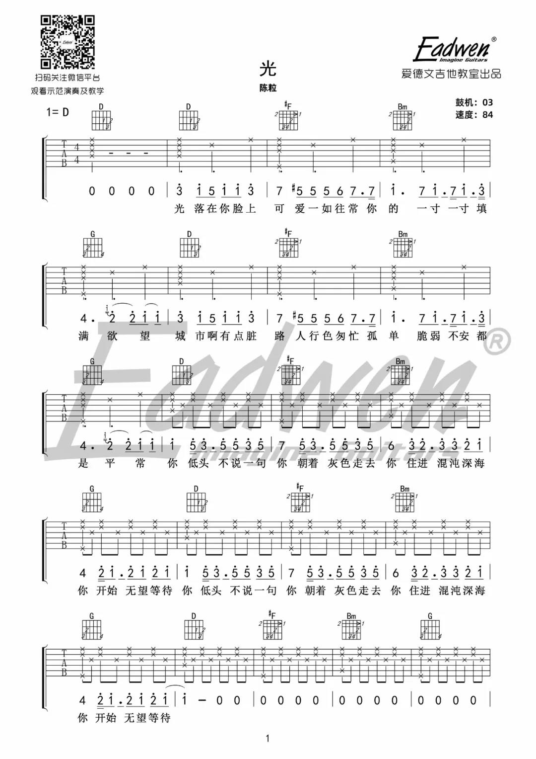 曲谱介绍: 陈粒《光》吉他弹唱谱,采用D调指法编配,共有3张高清图谱。