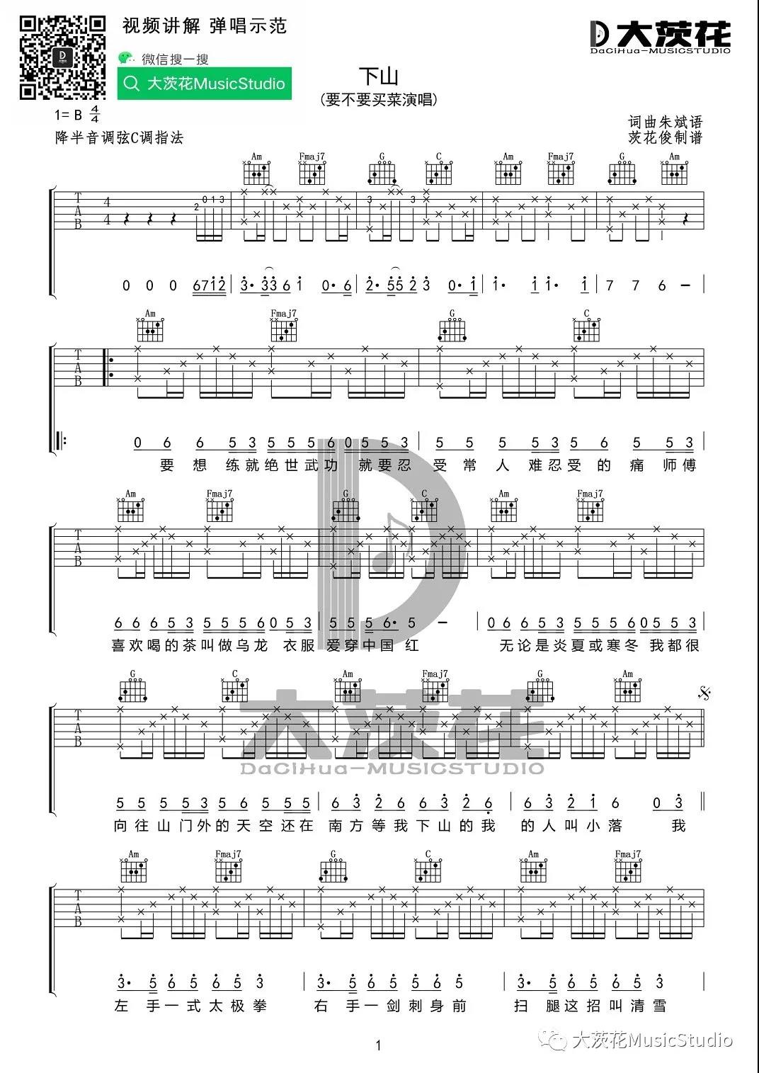 曲谱介绍: 要不要买菜《下山》吉他弹唱谱,采用B调指法编配,共有2张高清图谱,免翻页排版设计。