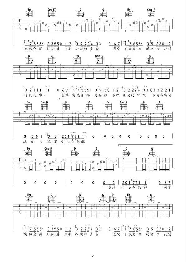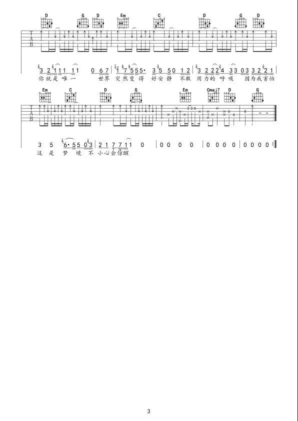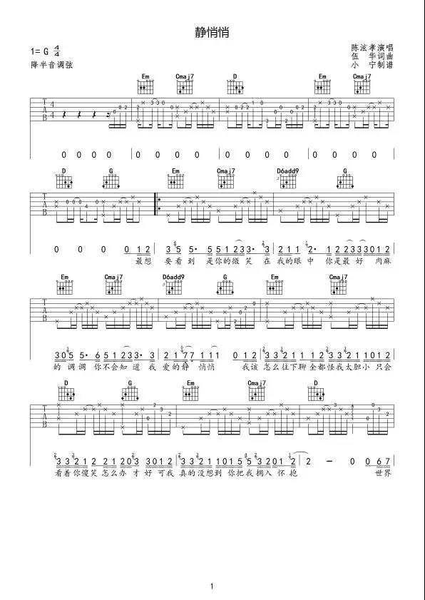 曲谱介绍: 陈泫孝《静悄悄》吉他弹唱谱,采用G调指法编配,共有3张高清图谱。