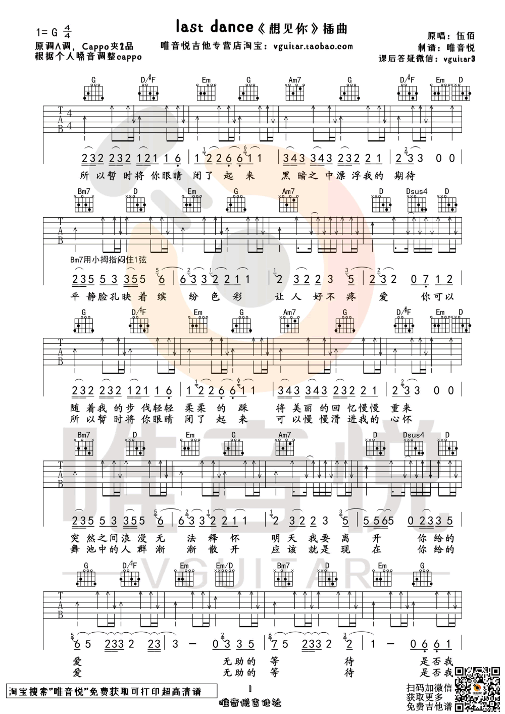 曲谱介绍: 伍佰《LastDance》吉他弹唱谱,采用G调指法编配,共有2张高清图谱,免翻页排版设计。