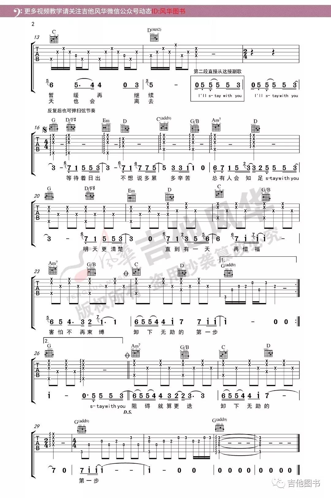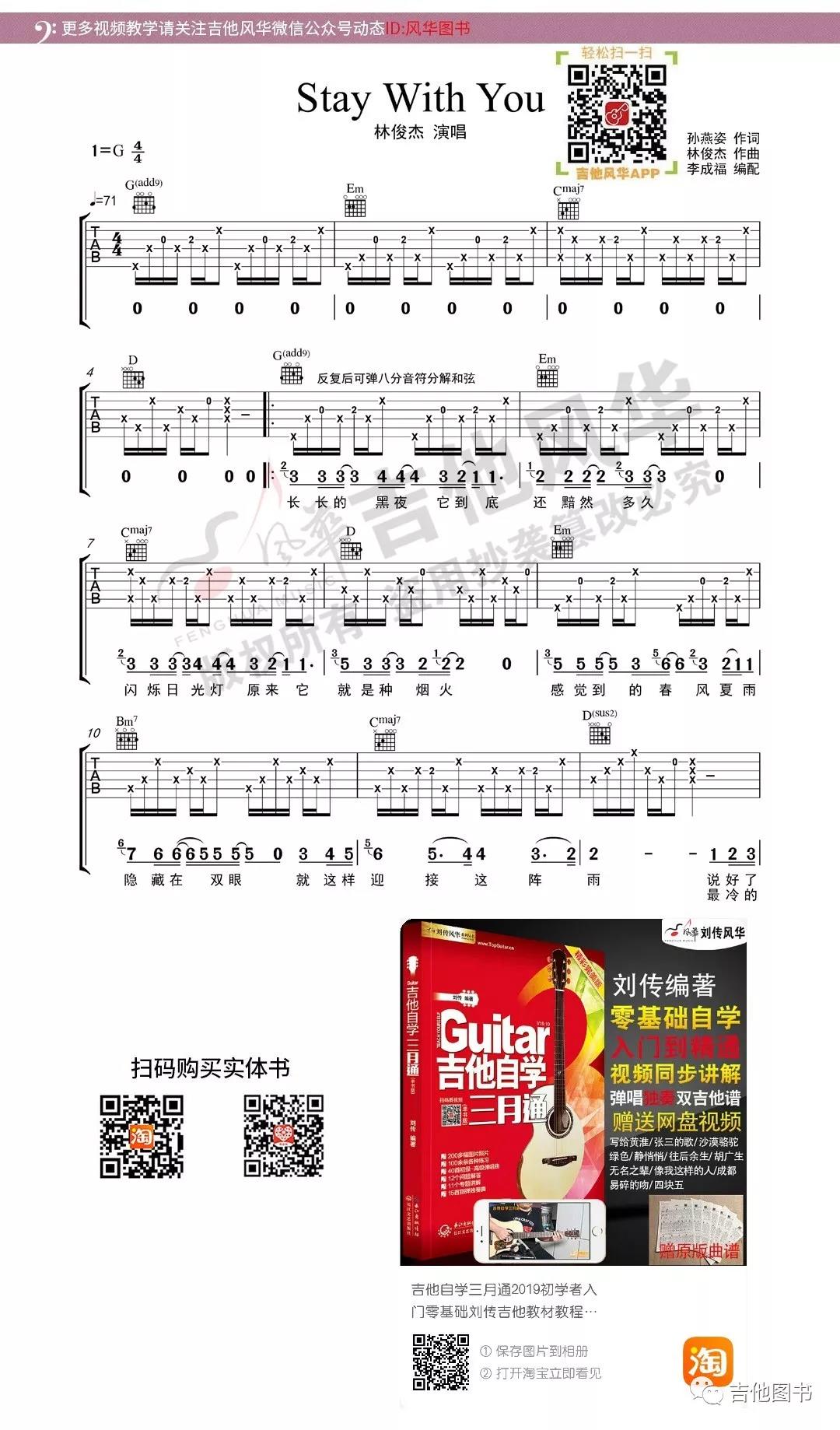 曲谱介绍: 林俊杰《StayWithYou》吉他弹唱谱,采用G调指法编配,共有2张高清图谱,免翻页排版设计。