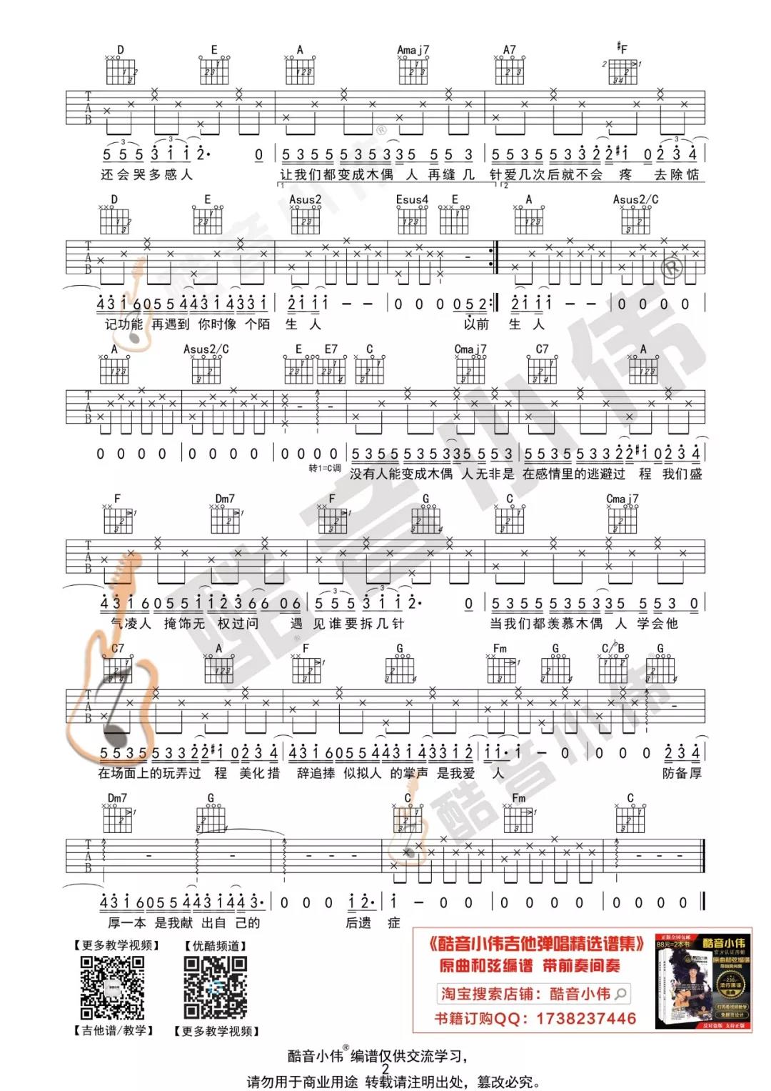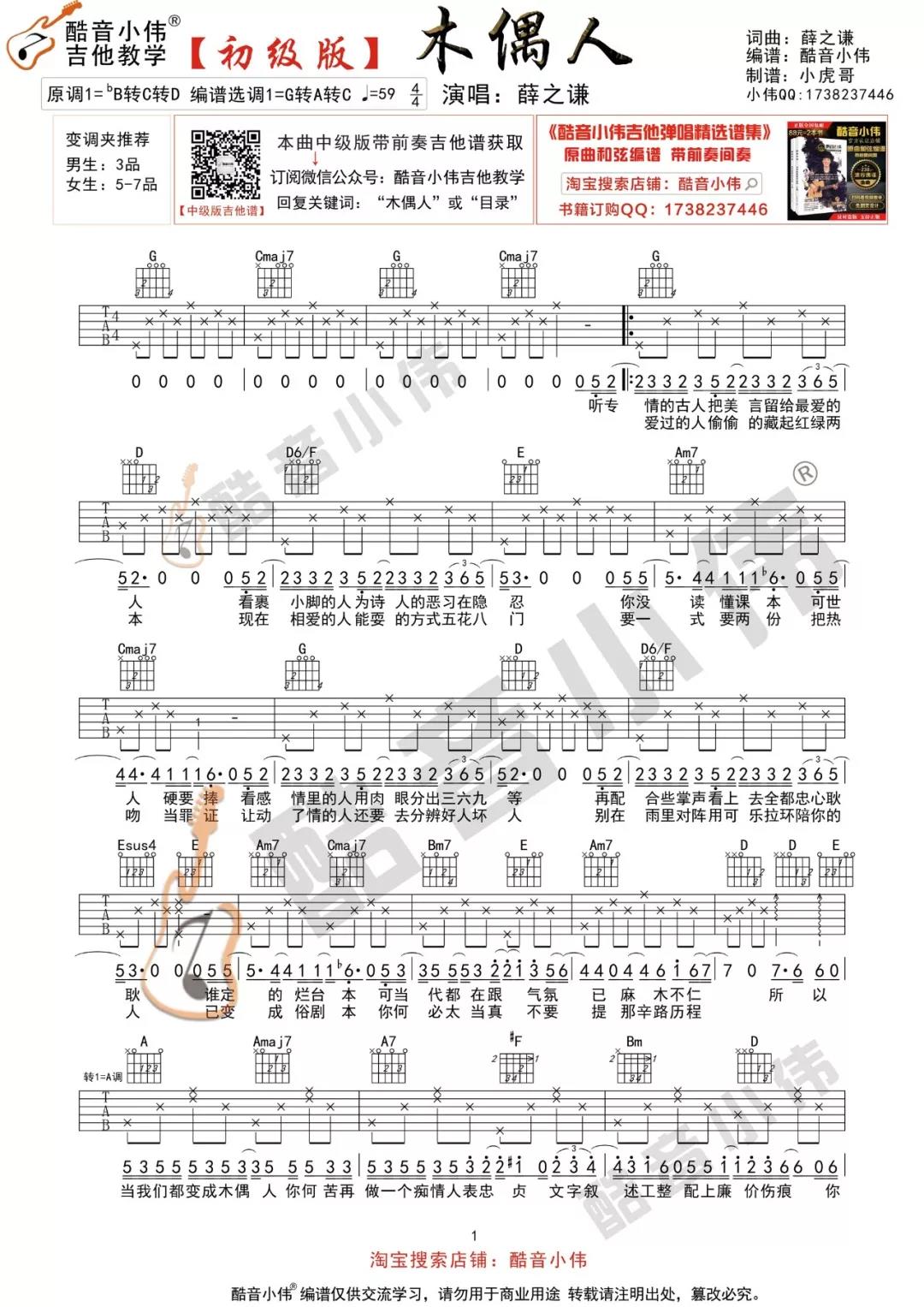 曲谱介绍: 薛之谦《木偶人》吉他弹唱谱,采用G调指法编配,共有2张高清图谱,免翻页排版设计。