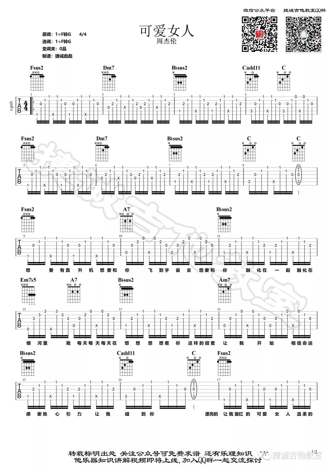 曲谱介绍: 周杰伦《可爱女人》吉他弹唱谱,采用F调指法编配,共有2张高清图谱,免翻页排版设计。